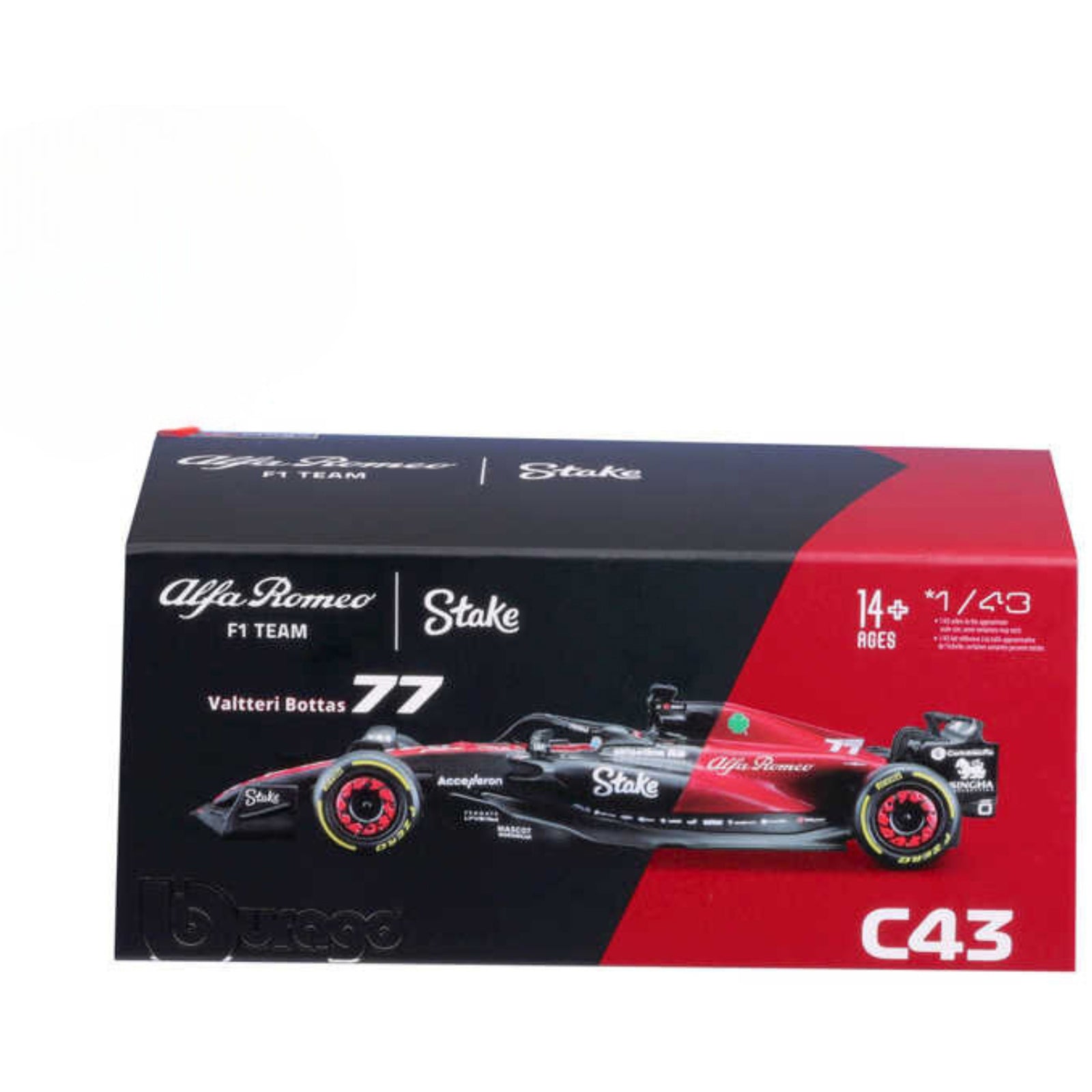 This Alfa Romeo C43 Team Stake (No.77 With Helmet 2023 driven by Valtteri Bottas) diecast model grand prix car is red/black and comes attached to display base and in a display case. It is made by Bburago and features working wheels. Made from metal and plastic it is 1:43 scale measuring approx. 13cm / 5.1in long.