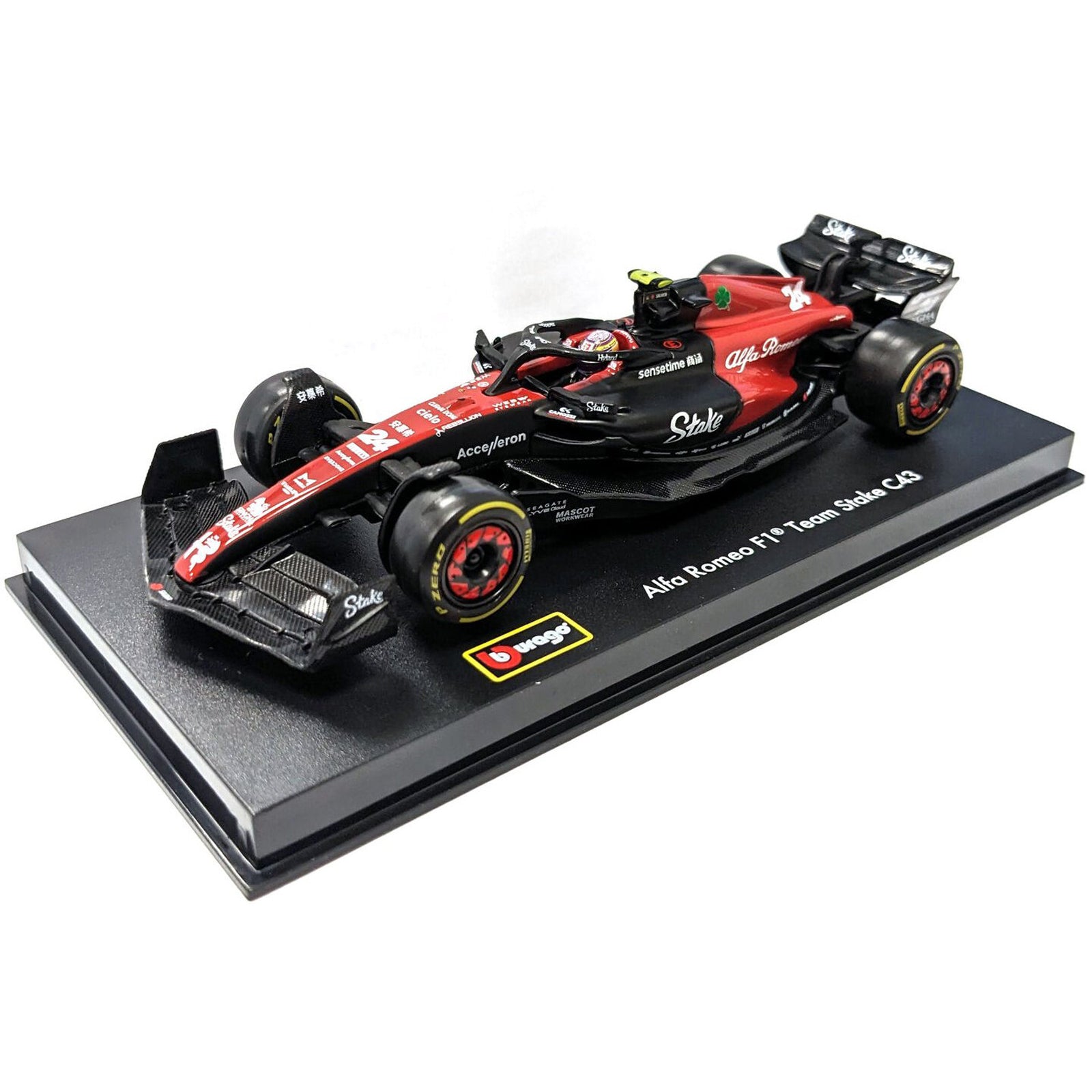 This Alfa Romeo C43 Team Stake (No.24 With Helmet 2023 driven by Zhou Guanyu) diecast model grand prix car is red/black and comes attached to display base and in a display case. It is made by Bburago and features working wheels. Made from metal and plastic it is 1:43 scale measuring approx. 13cm / 5.1in long.