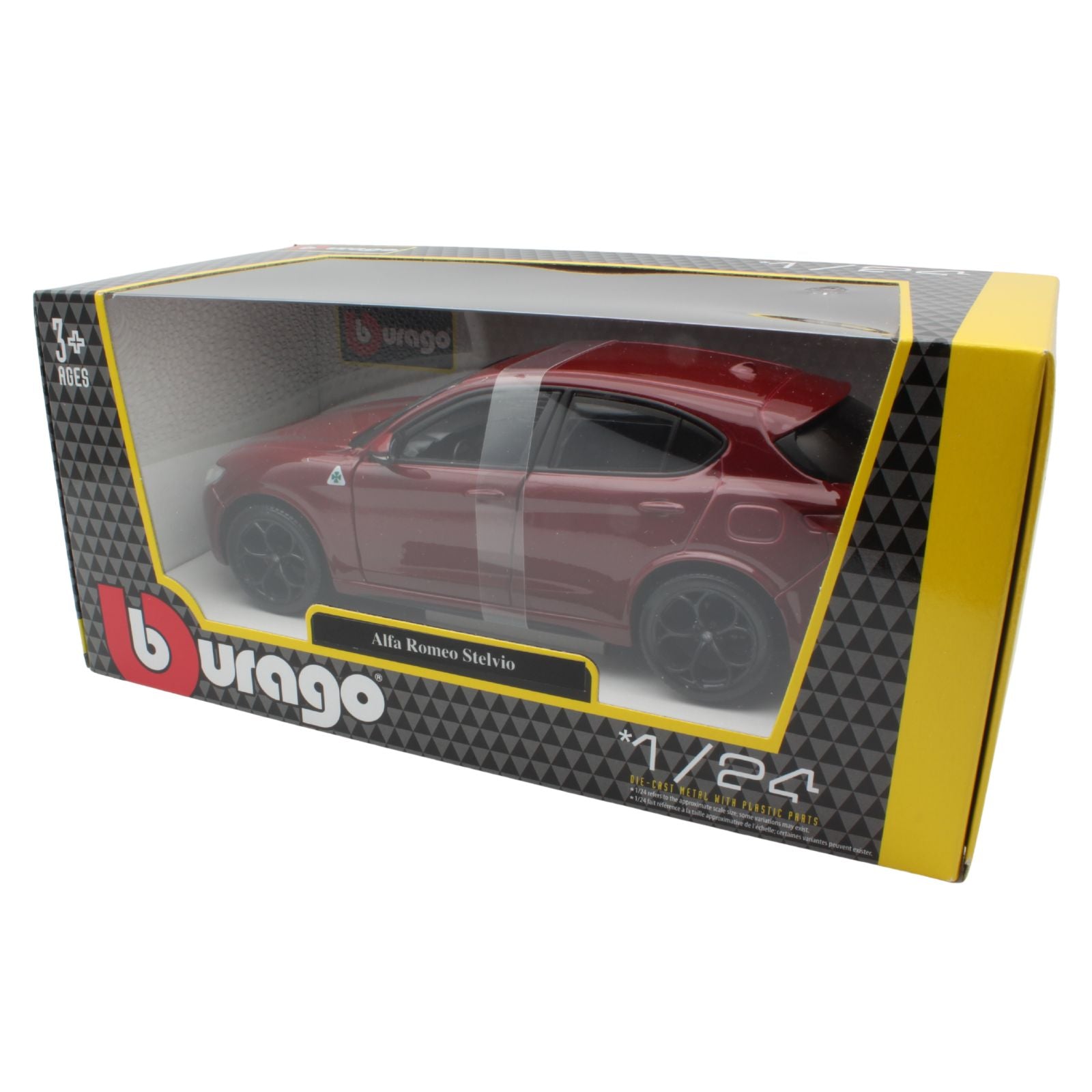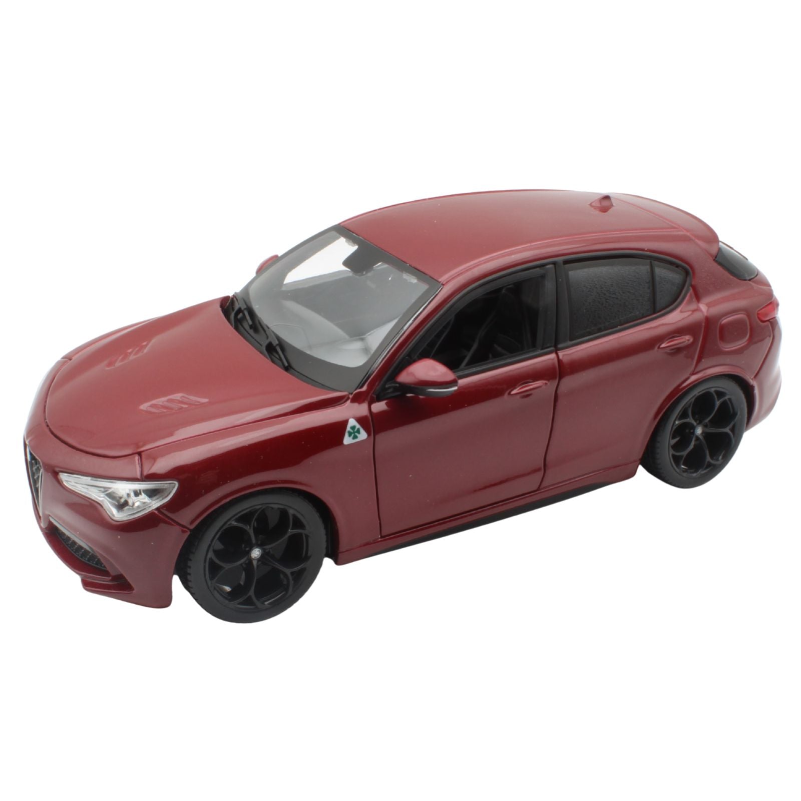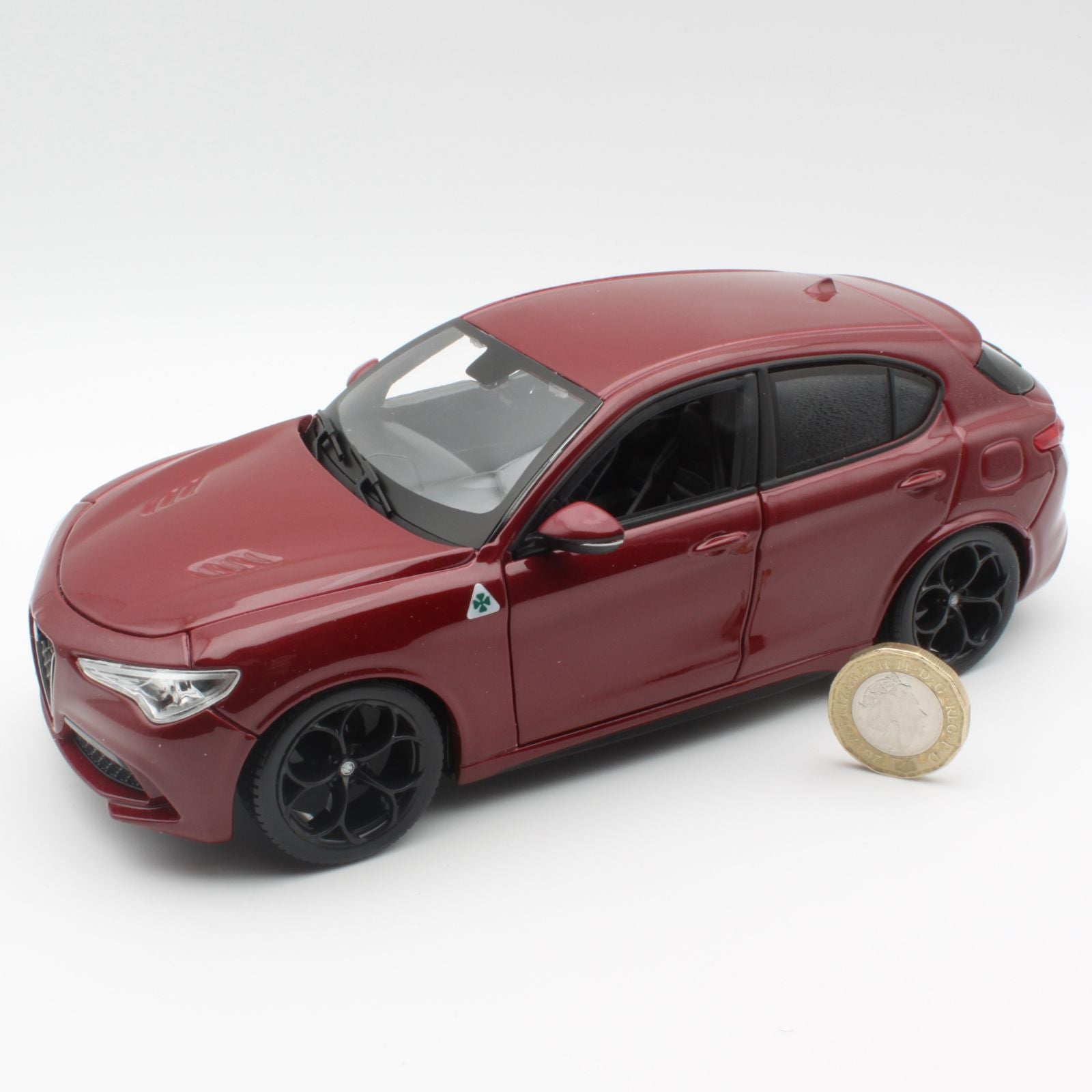 This Alfa Romeo Stelvio diecast model car is metallic red. It is made by Bburago and It has opening doors and also features working wheels. Made from metal and plastic it is 1:24 scale measuring approx. 17cm / 6.7in long.
