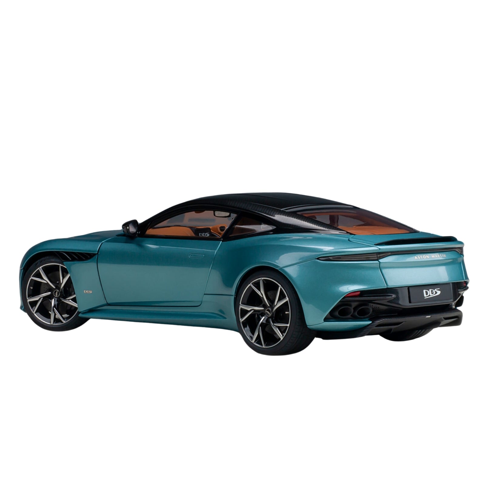 This Aston Martin (DBS Superleggera 2019) composite model car is caribbean pearl blue and features working wheels, steering and opening doors, bonnet, boot. It is made by AUTOart and is 1:18 scale (approx. 26cm / 10.2in long).