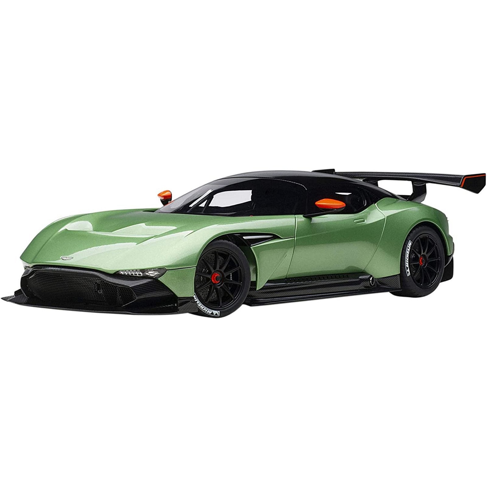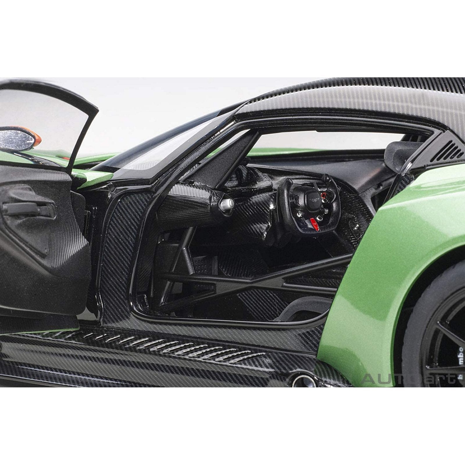 This Aston Martin Vulcan (2015) composite model car is apple tree green and features working steering, suspension, wheels and opening bonnet with engine, boot, doors. It is made by AUTOart and is 1:18 scale (approx. 25cm / 9.8in long).