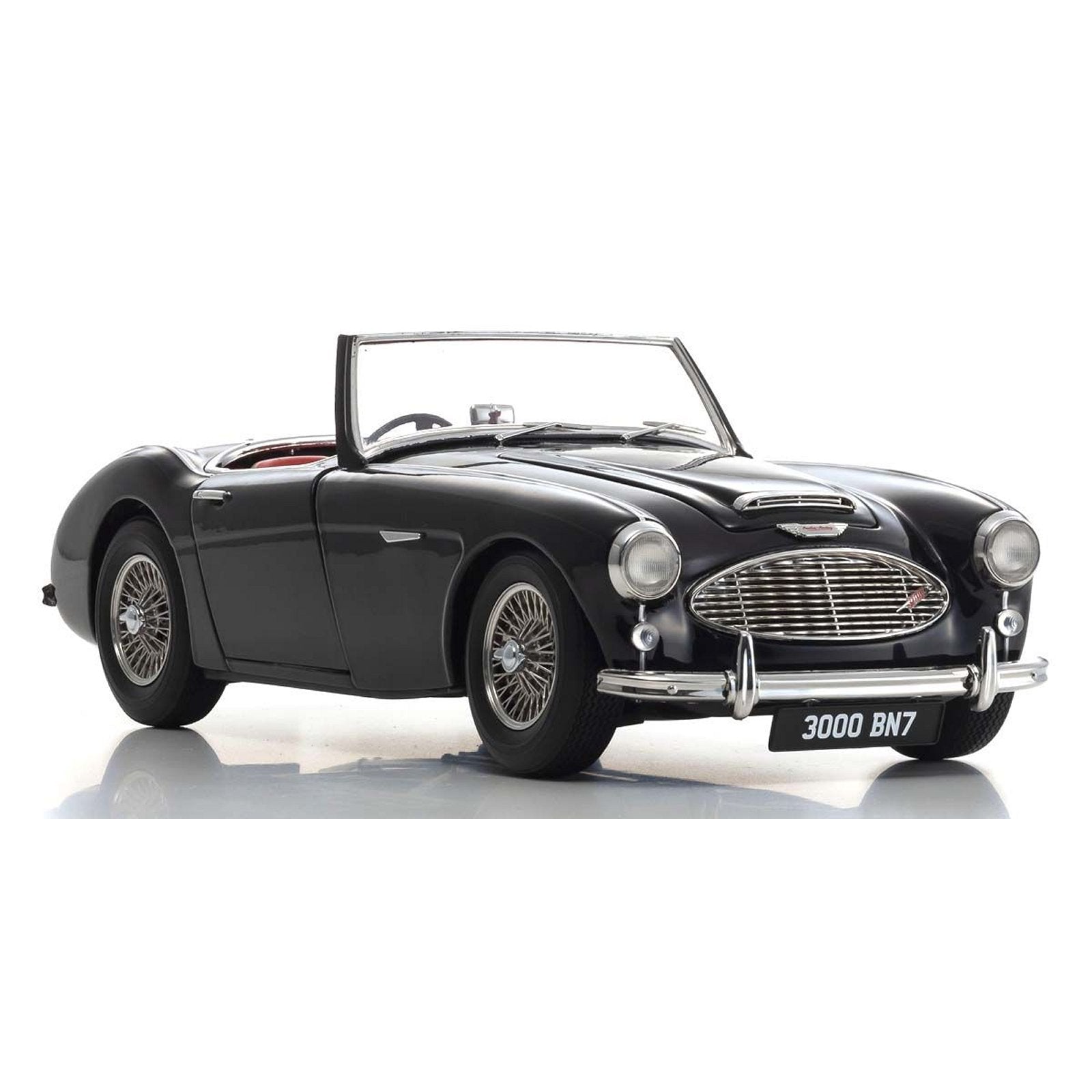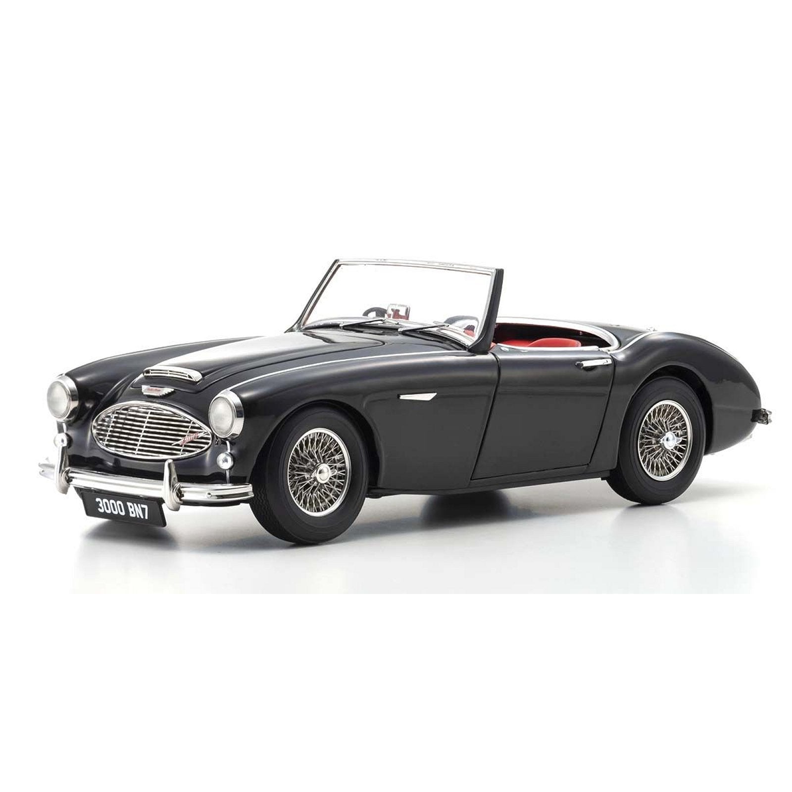 This Austin Healey 3000 diecast model car is black and features working wheels and opening doors, bonnet, boot. It is made by Kyosho and is 1:18 scale (approx. 23cm / 9.1in long).