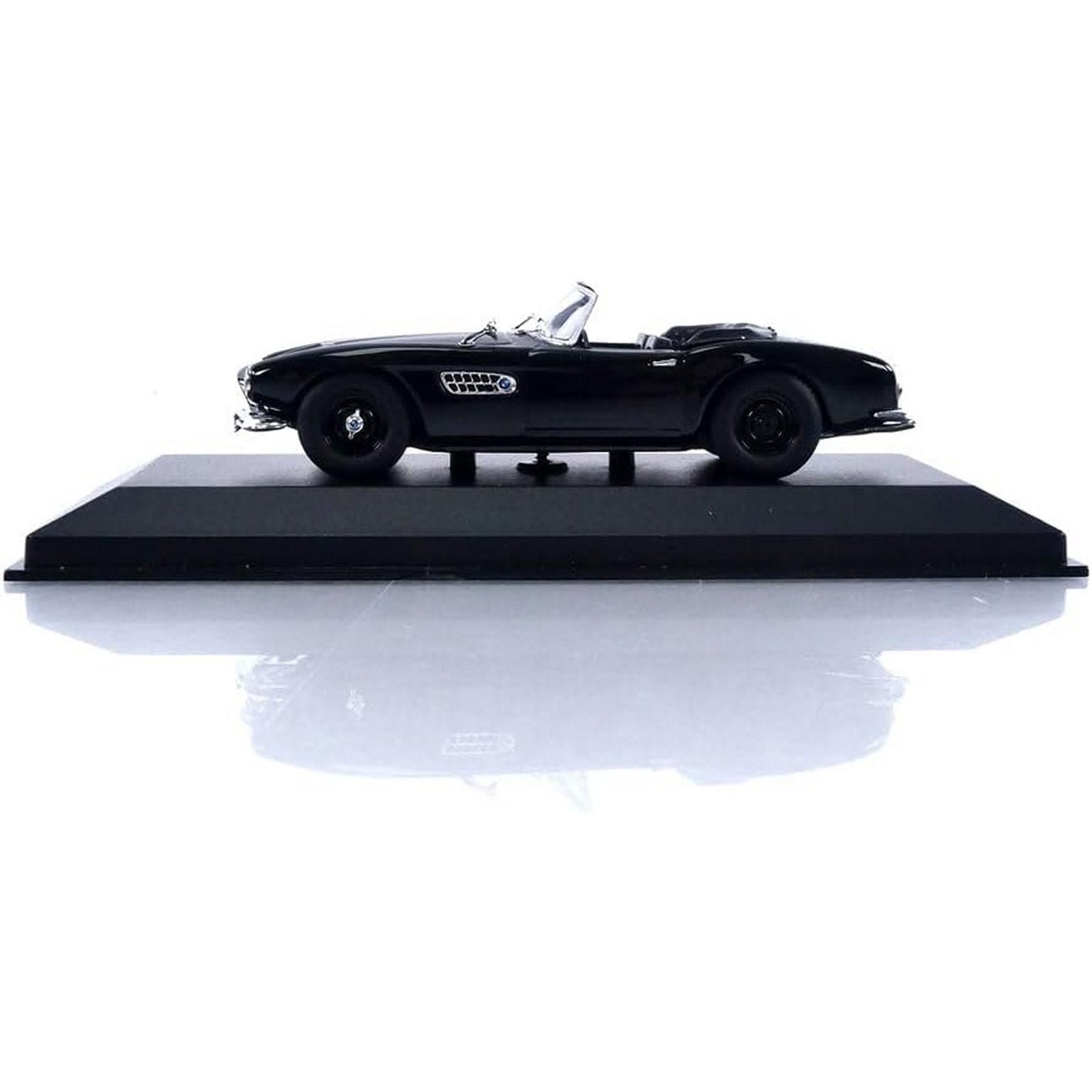 This BMW 507 (1957) diecast model car is black and comes attached to a display base and in a display case. It is made by Minichamps and features working wheels. Made from metal and plastic it is 1:43 scale measuring approx. 10cm / 3.9in long.