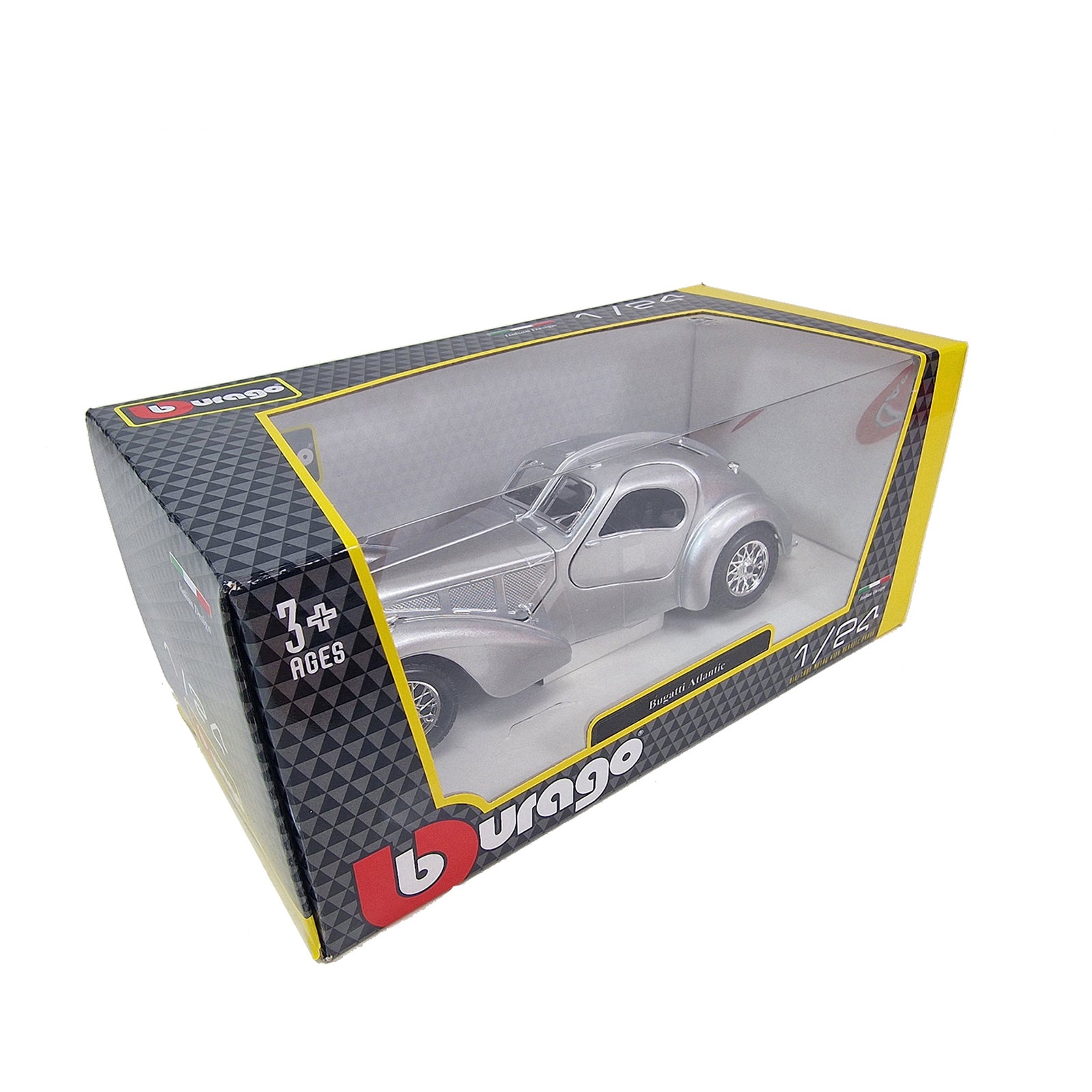 This Bugatti 57SC Atlantic (1938) diecast model car is silver and features working wheels and opening bonnet with engine, doors. It is made by Bburago and is 1:24 scale (approx. 18cm / 7.1in long). This model also comes in its own display case to keep it in perfect dust free condition.