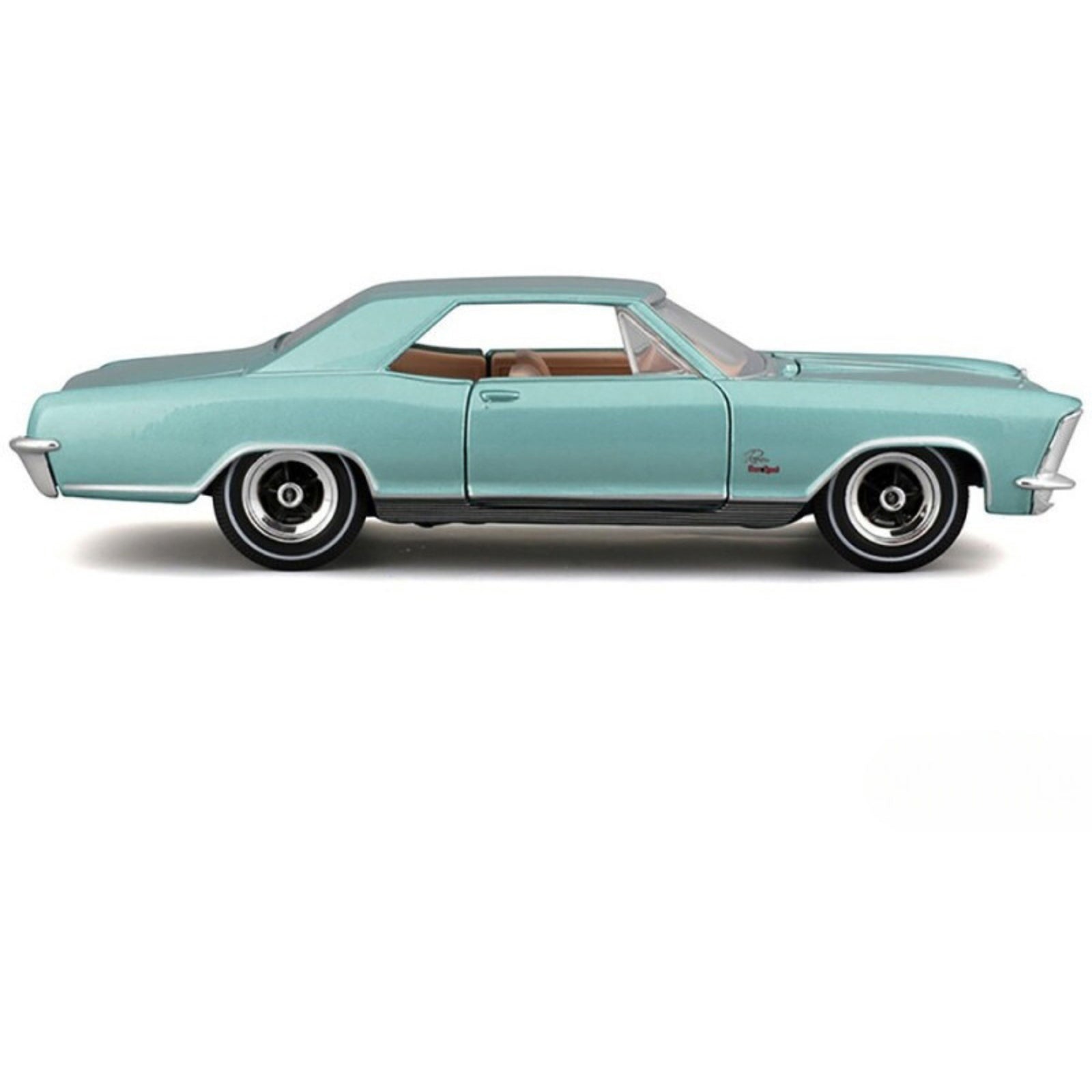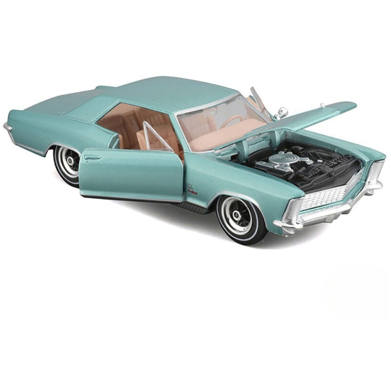 This Buick Riviera (1965) diecast model car is blue. It is made by Maisto and It has opening bonnet and doors and also features working wheels. Made from metal and plastic it is 1:26 scale measuring approx. 19cm / 7.5in long.