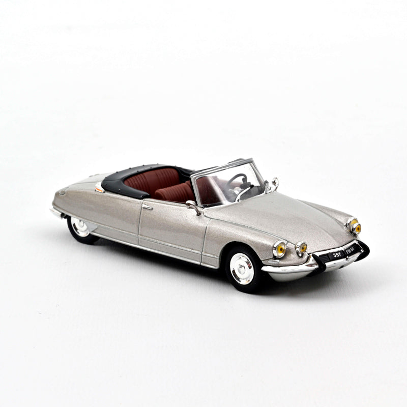 This Citroen DS 19 Cabriolet (1965) diecast model car is silver and features working wheels and detachable roof. It is made by Norev and is 1:43 scale (approx. 11cm / 4.3in long). This model also comes in its own display case to keep it in perfect dust free condition.