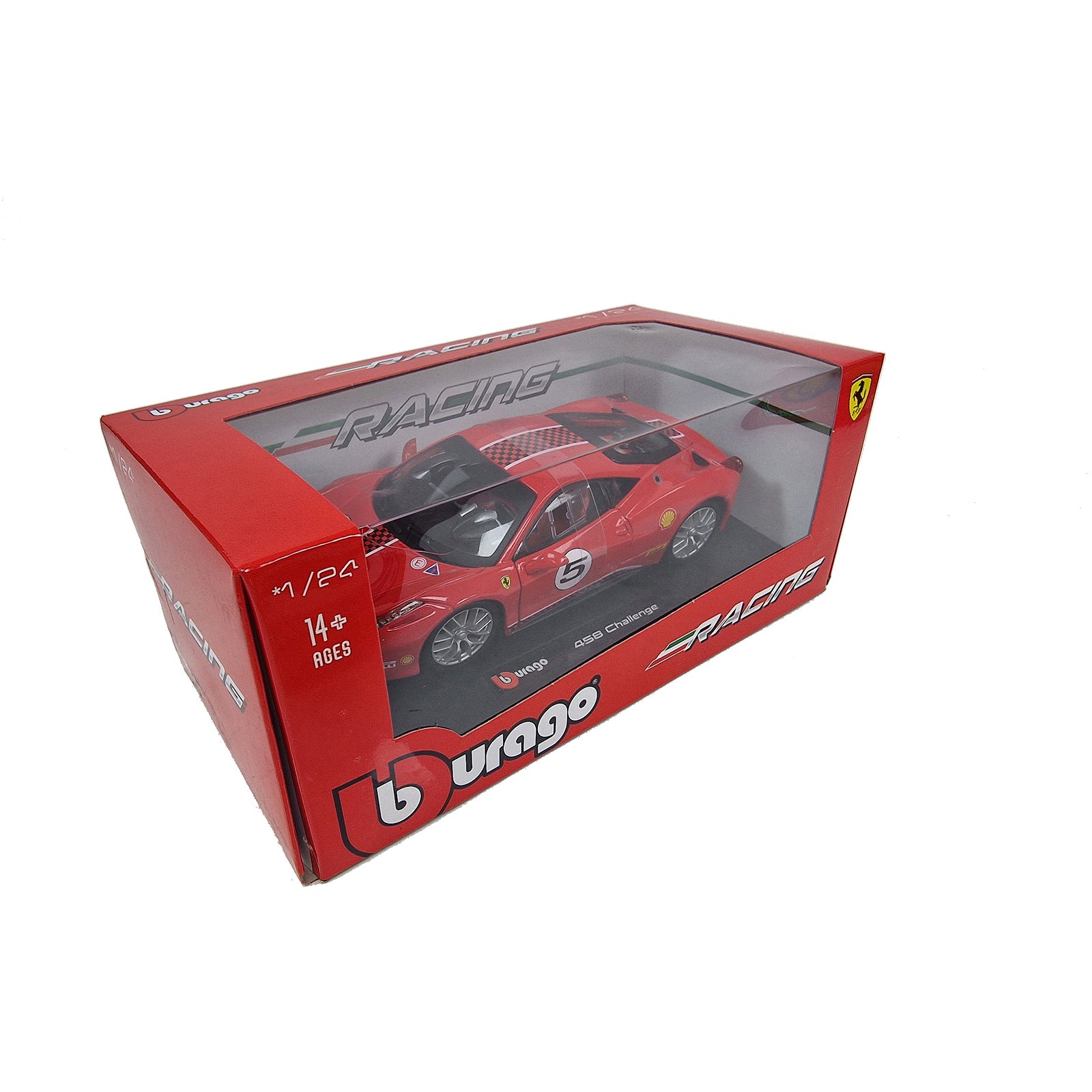This Ferrari 458 Challenge diecast model is red and features working wheels and opening boot with engine, doors. It is made by Bburago and is 1:24 scale (approx. 18cm / 7.1in long).