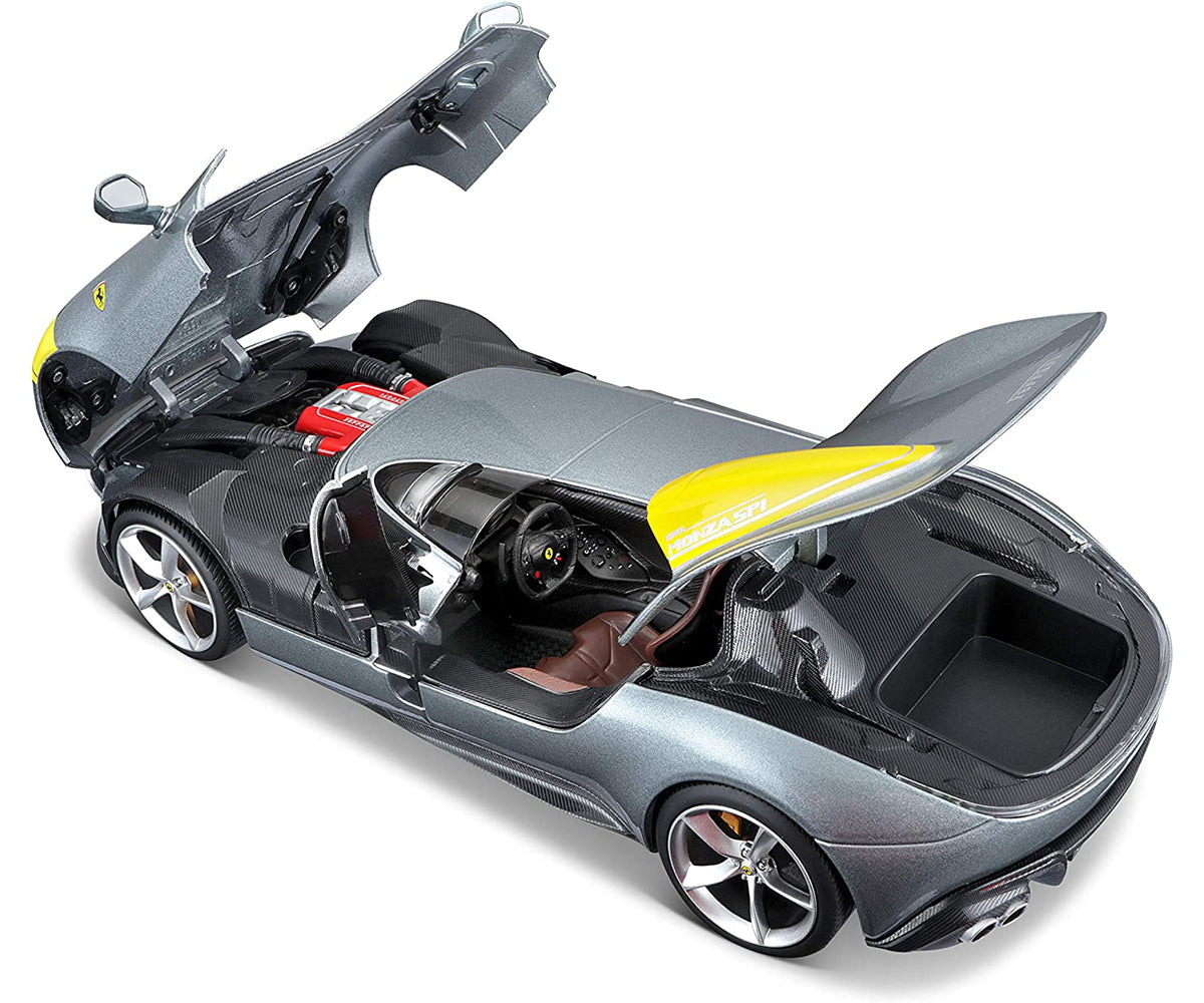 This Ferrari Monza SP1 diecast model is silver and features working wheels. It is made by Bburago and is 1:18 scale (approx. 28cm / 11in long).