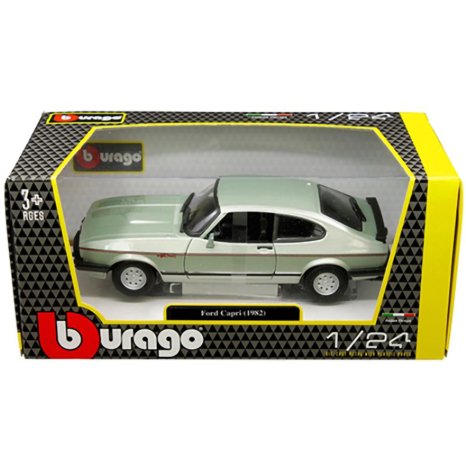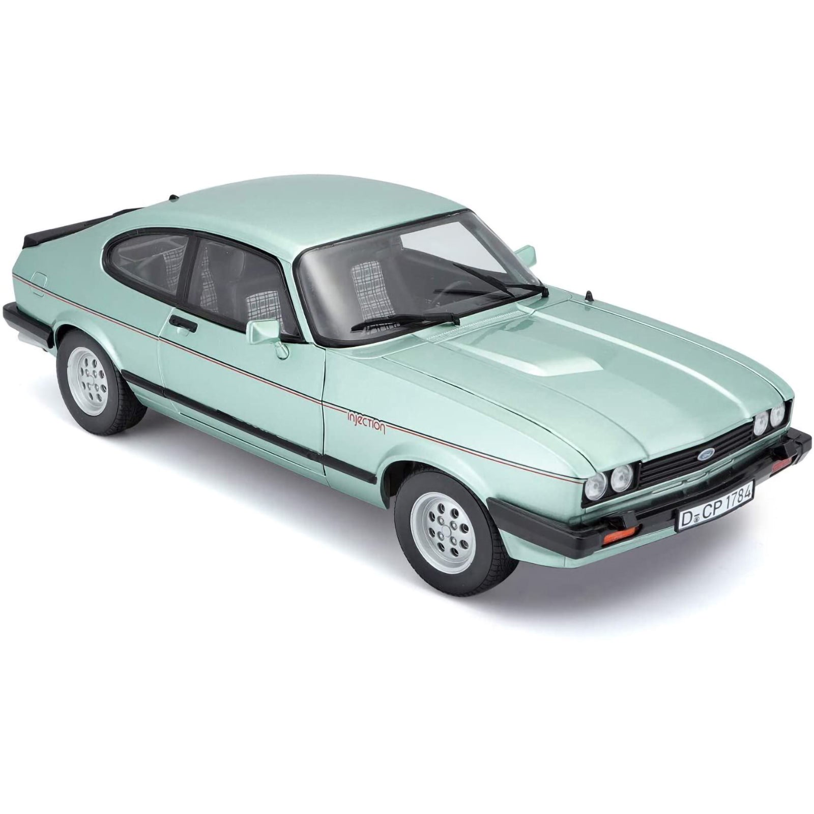 This Ford Capri 2.8i diecast model car is metallic green and features working wheels and opening doors. It is made by Bburago and is 1:24 scale (approx. 17cm / 6.7in long).