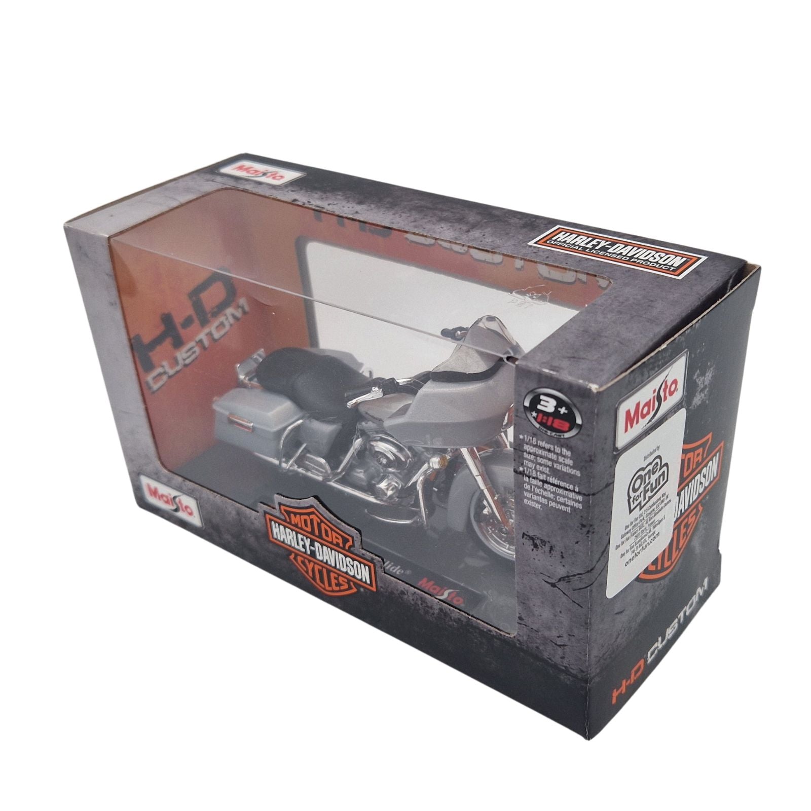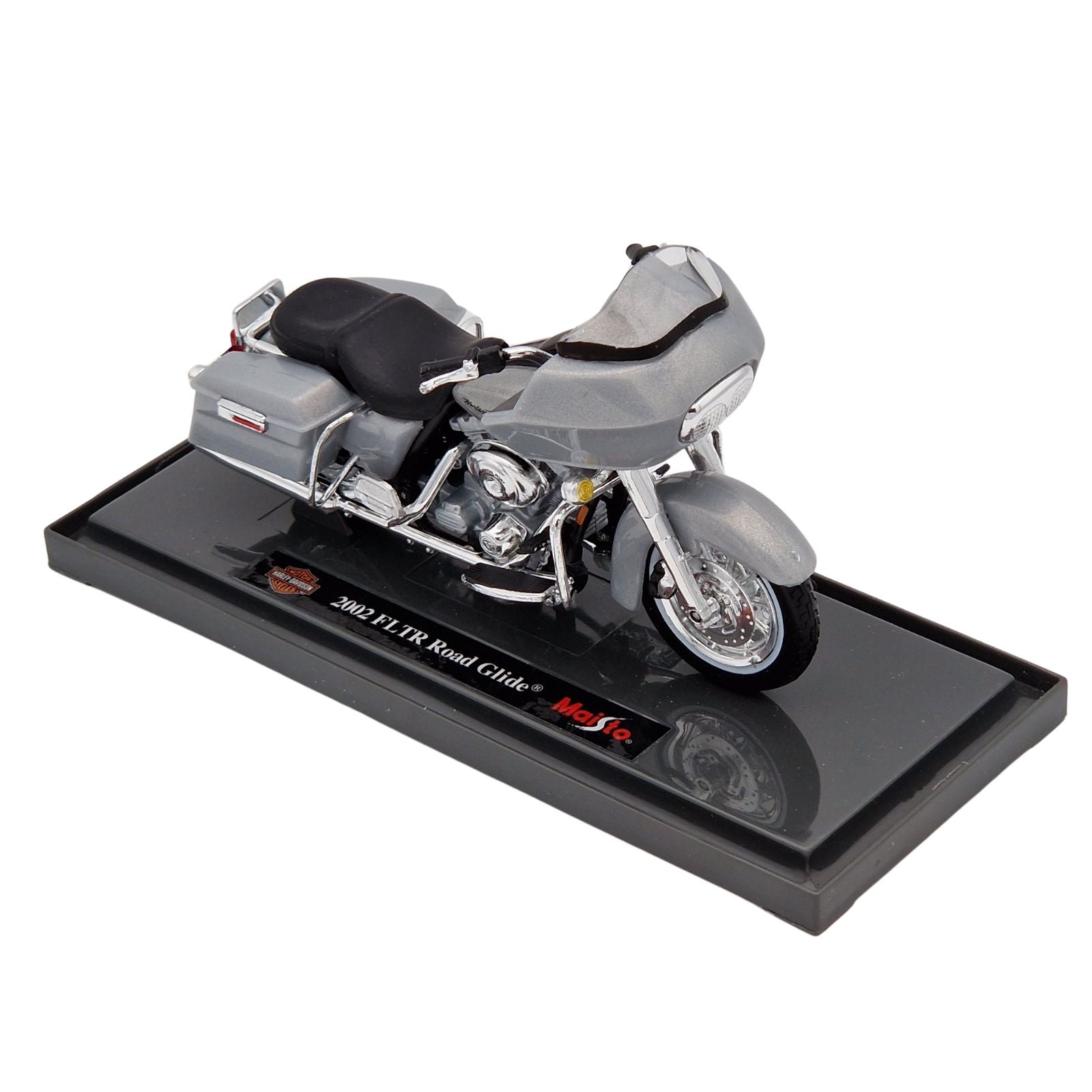 This Harley Davidson FLTR Road Glide (2002) diecast model motorcycle is silver and comes attached to display base. It is made by Maisto and features working side stand and steering as well as working wheels. Made from metal and plastic it is 1:18 scale measuring approx. 13cm / 5.1in long.