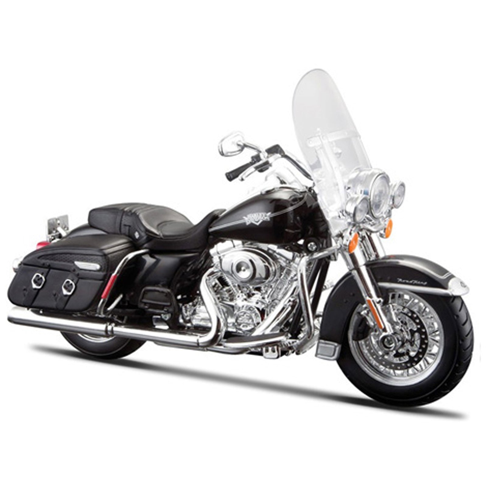 This Harley Davidson Road King Classic FLHRC (2013) diecast model motorcycle is black and features working stand, steering, wheels. It is made by Maisto and is 1:12 scale (approx. 18cm / 7.1in long).