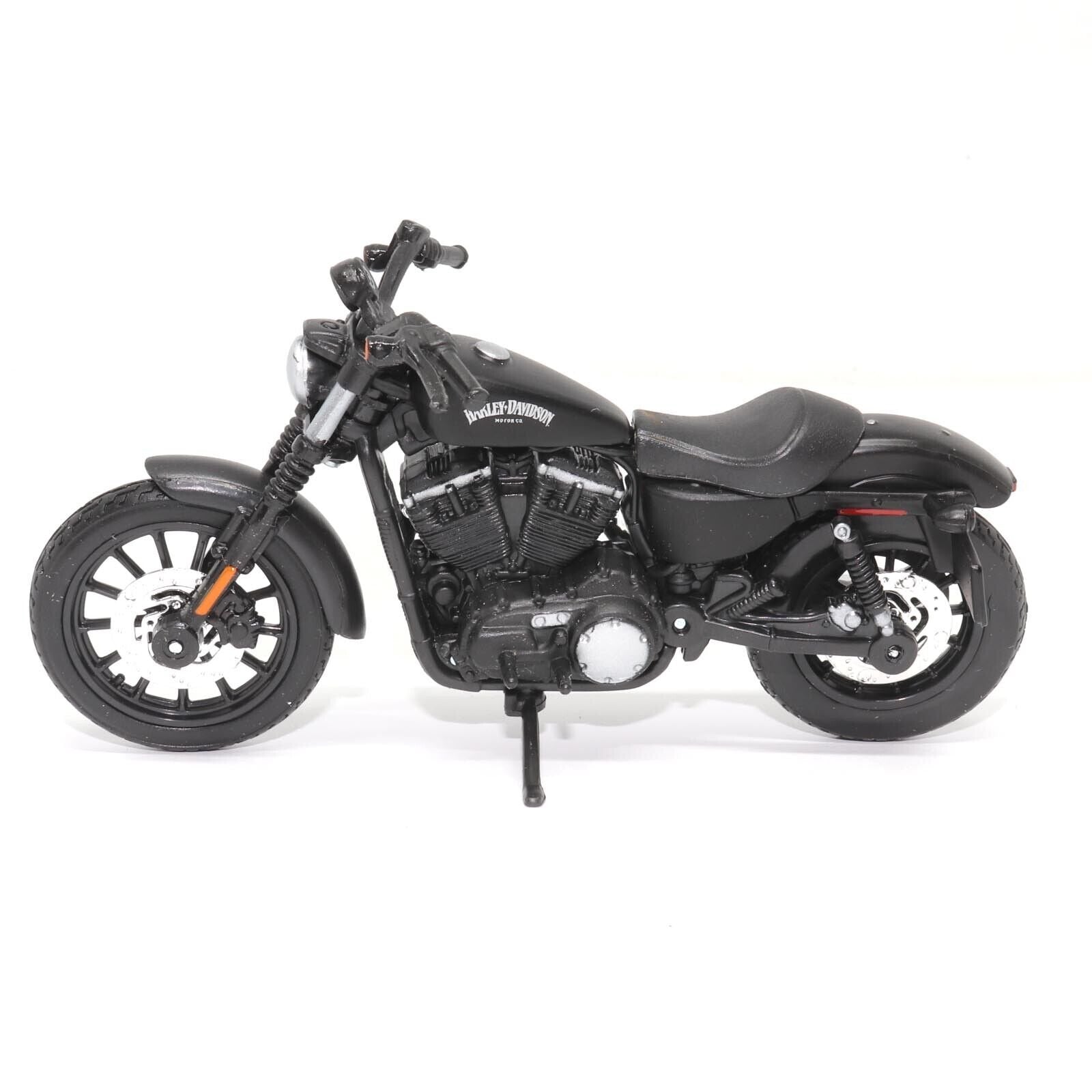 This Harley Davidson Sportster Iron 883 (2014) diecast model motorcycle is black and features working wheels, steering. It is made by Maisto and is 1:18 scale (approx. 12cm / 4.7in long).
