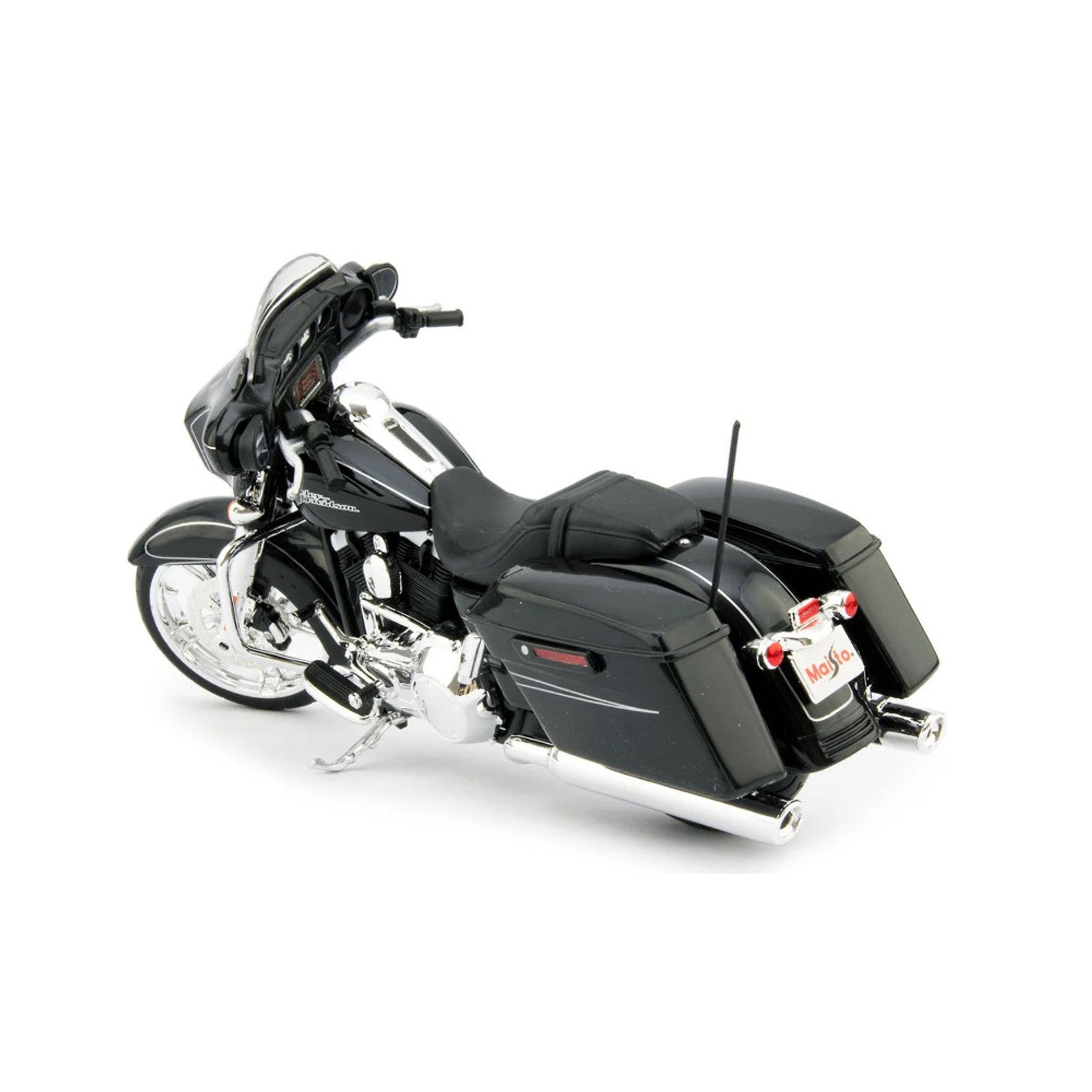 This Harley Davidson Street Glide Special (2015) diecast model motorcycle is black and features working stand, steering, wheels. It is made by Maisto and is 1:12 scale (approx. 18cm / 7.1in long).