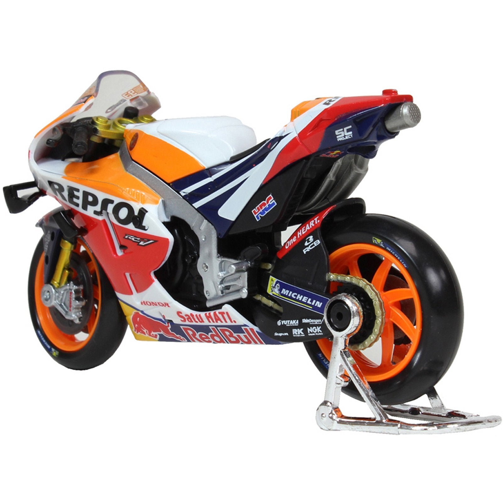 This Honda Repsol (RC2 13V 2021 riden by Marc Marquez) diecast model motorcycle is red/white/orange and features working wheels. It is made by Maisto and is 1:18 scale (approx. 11cm / 4.3in long).