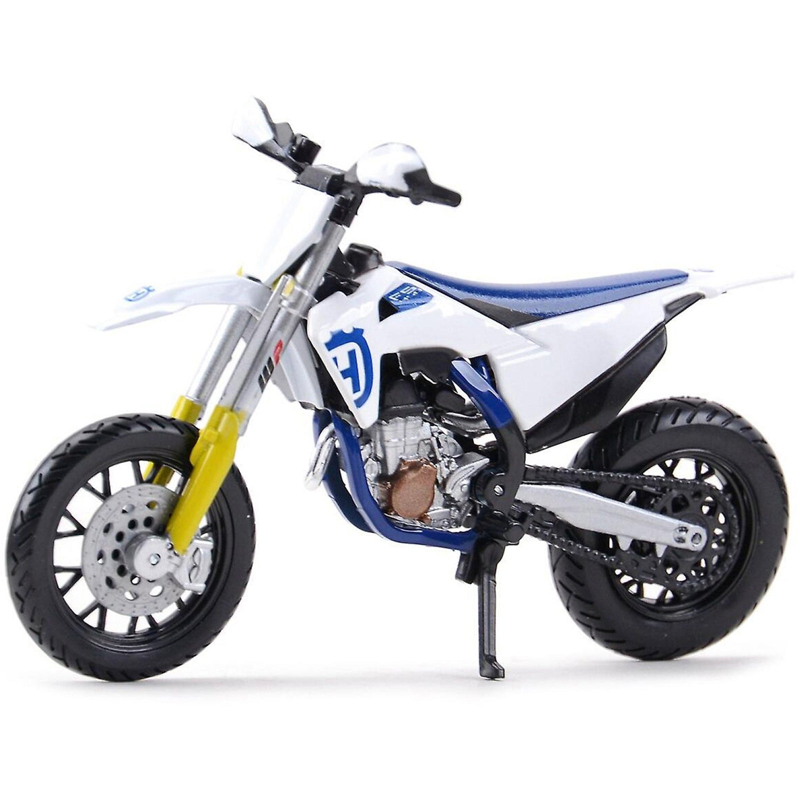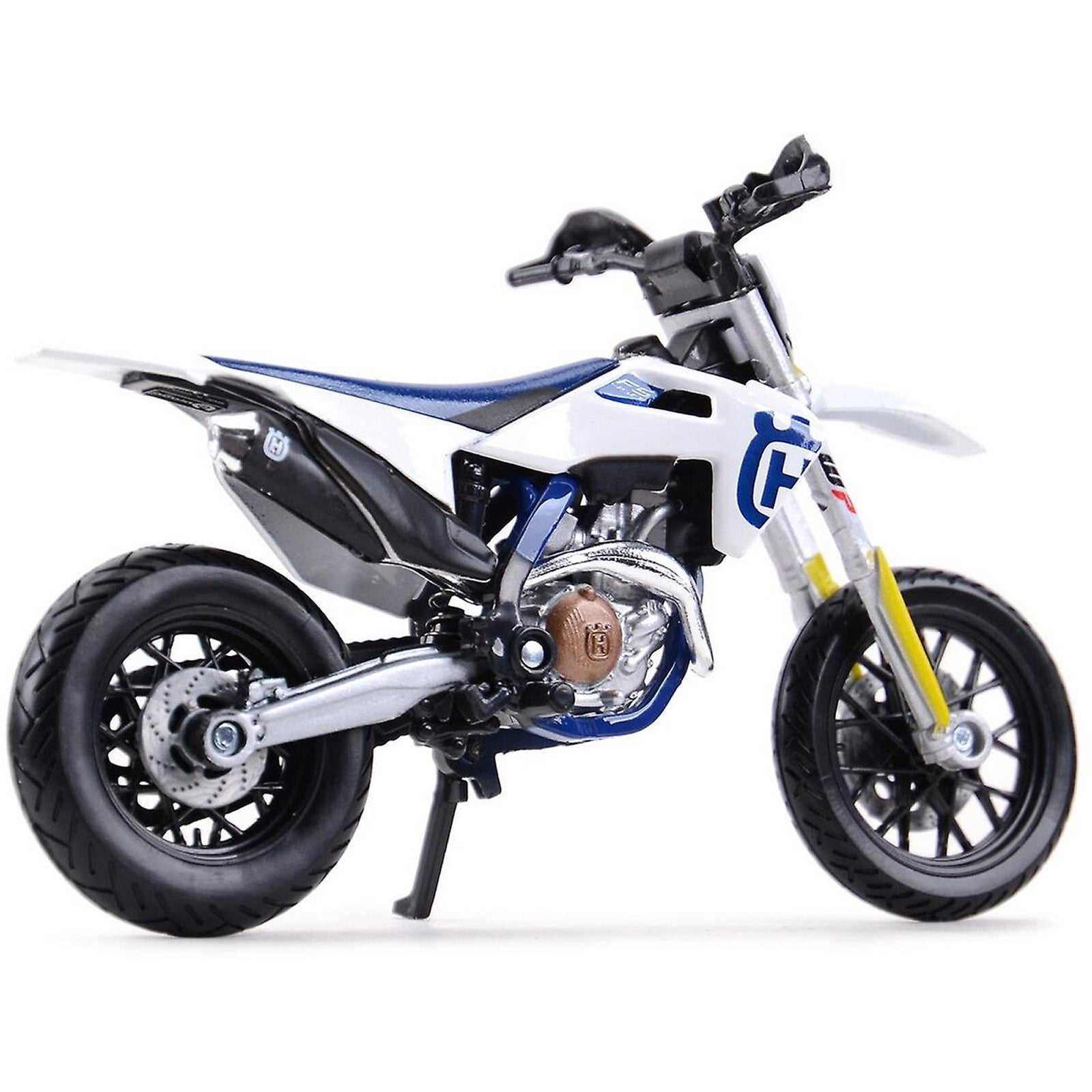 This Husqvarna FS 450 Supermoto diecast model motorcycle is white/blue and features working wheels, stand. It is made by Bburago and is 1:18 scale (approx. 12cm / 4.7in long).