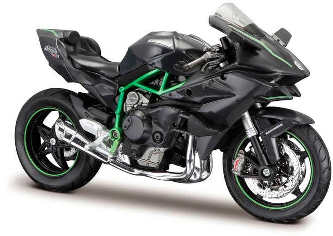 This Kawasaki Ninja H2R (Skill Level 2 - 38 Parts) diecast model motorcycle kit is black and features working wheels, steering, stand. It is made by Maisto and is 1:12 scale (approx. 16cm / 6.3in long).