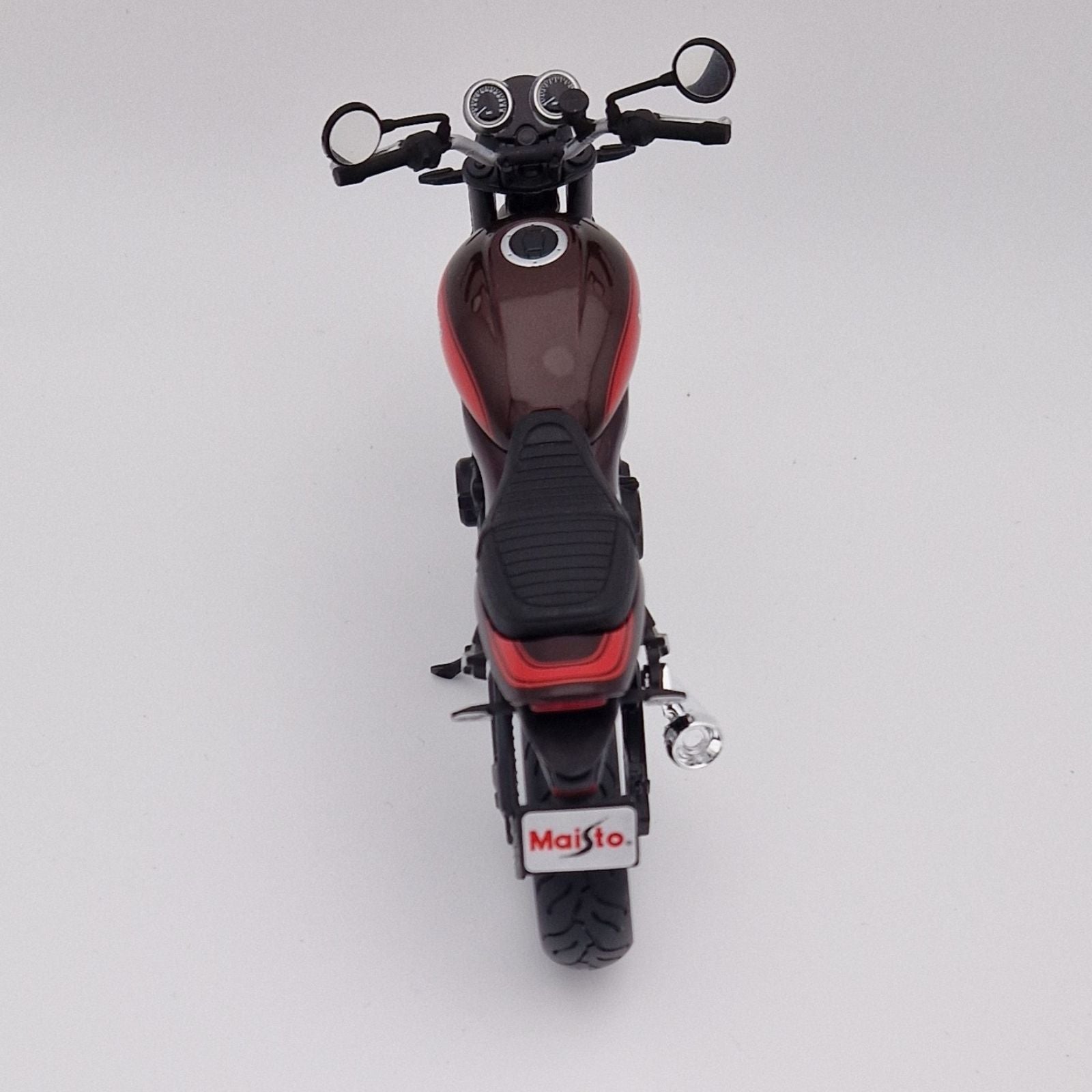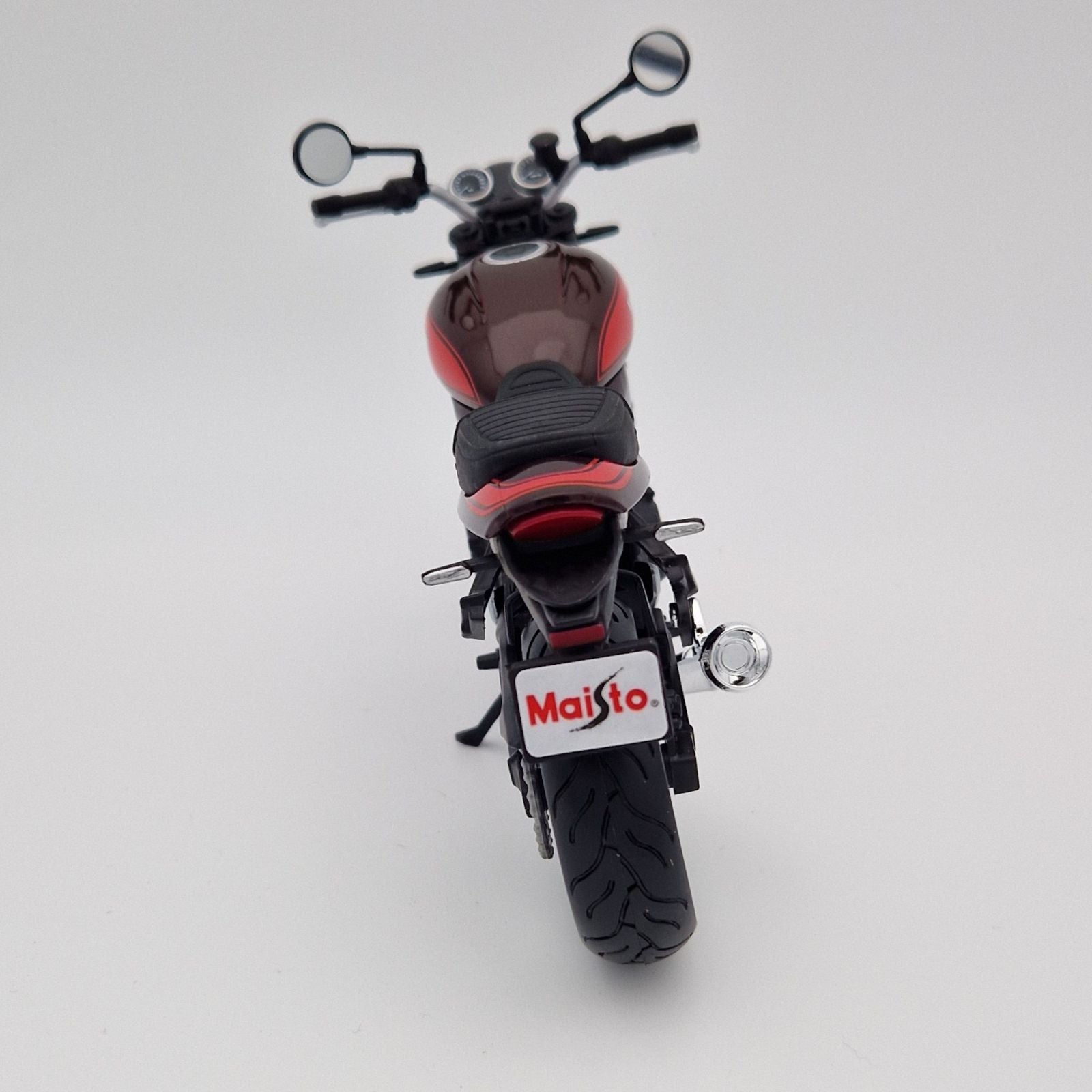 This Kawasaki Z900RS diecast model motorcycle is retro burgundy/orange and comes attached to display base. It is made by Maisto and features working side stand and steering as well as working wheels. Made from metal and plastic it is 1:12 scale measuring approx. 16cm / 6.3in long.