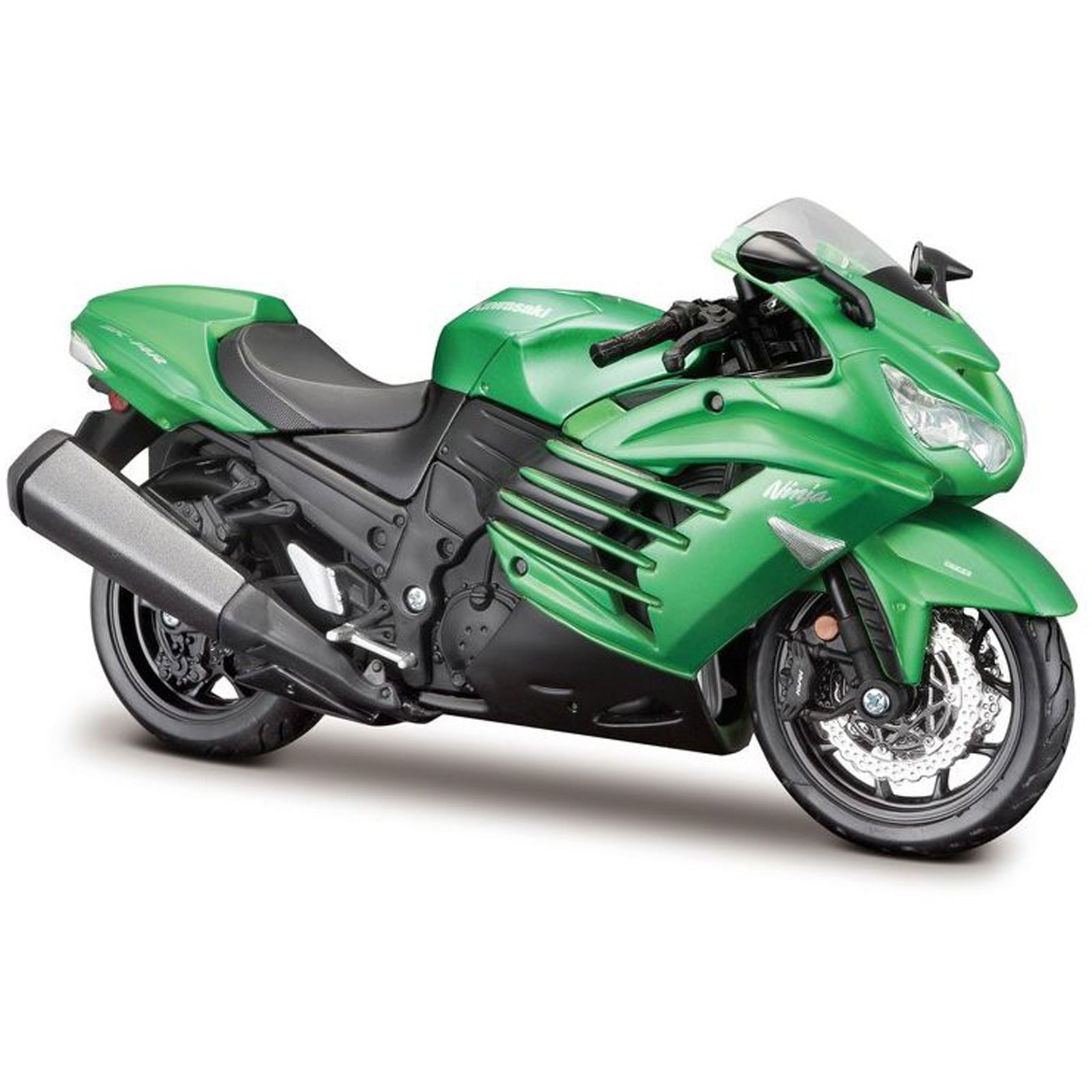 This Kawasaki ZX-14R Ninja diecast model motorcycle kit is green and features working stand, steering, wheels. It is made by Maisto and is 1:12 scale (approx. 15cm / 5.9in long).