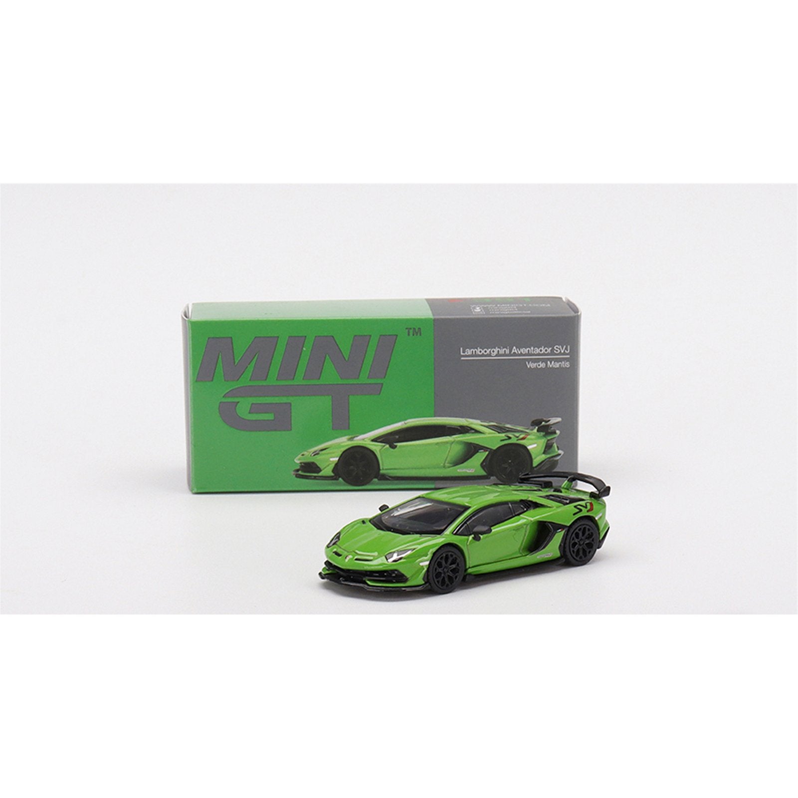 This Lamborghini Aventador SVJ (RHD) diecast model car is verde mantis and features working wheels. It is made by Mini GT and is 1:64 scale (approx. 8cm / 3.1in long).