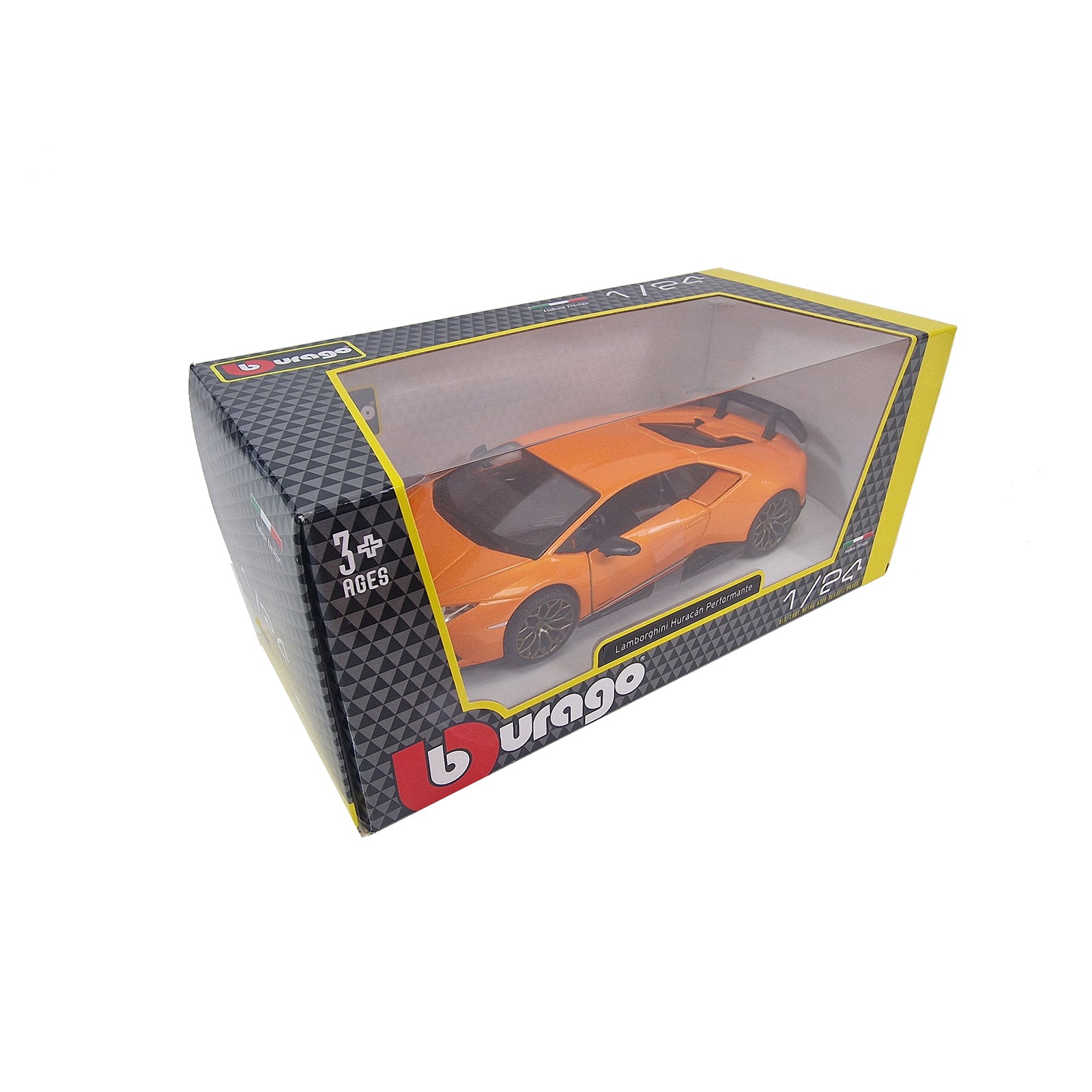 This Lamborghini Huracan Performante diecast model car is metallic orange and features working wheels and opening doors. It is made by Bburago and is 1:24 scale (approx. 17cm / 6.7in long).