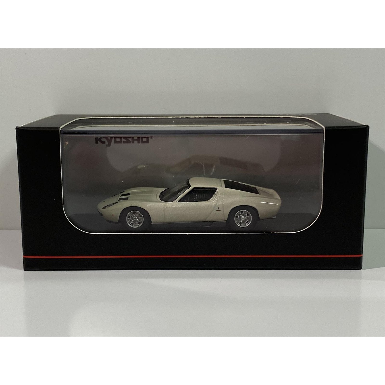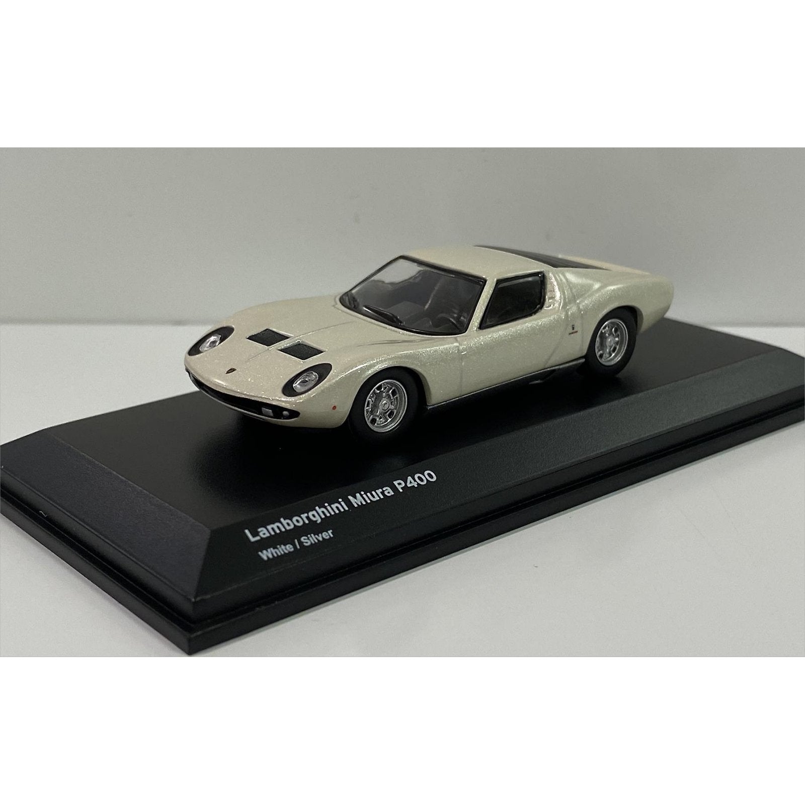 This Lamborghini Miura P400 diecast model car is white/silver and features working wheels. It is made by Kyosho and is 1:64 scale (approx. 7cm / 2.8in long). This model also comes in its own display case to keep it in perfect dust free condition.