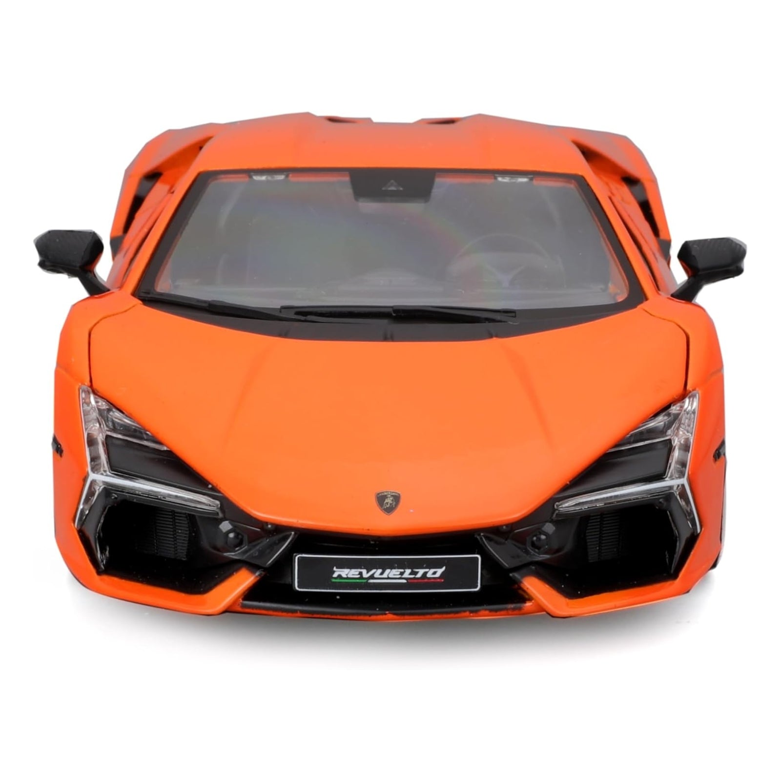 This Lamborghini Revuelto diecast model car is orange. It is made by Bburago and It has opening doors and engine compartment and also features working wheels. Made from metal and plastic it is 1:24 scale measuring approx. 20cm / 7.9in long.