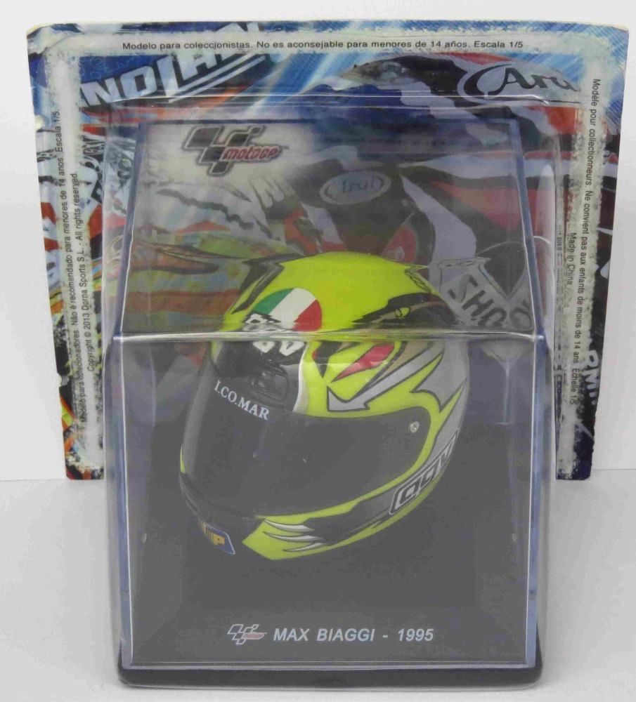 This Max Biaggi (World Champion MotoGP250 1995 riden by Max Biaggi) diecast model replica helmet is multi coloured and features working visor. It is made by Ex Mag and is 1:5 scale. This model also comes in its own display case to keep it in perfect dust free condition.