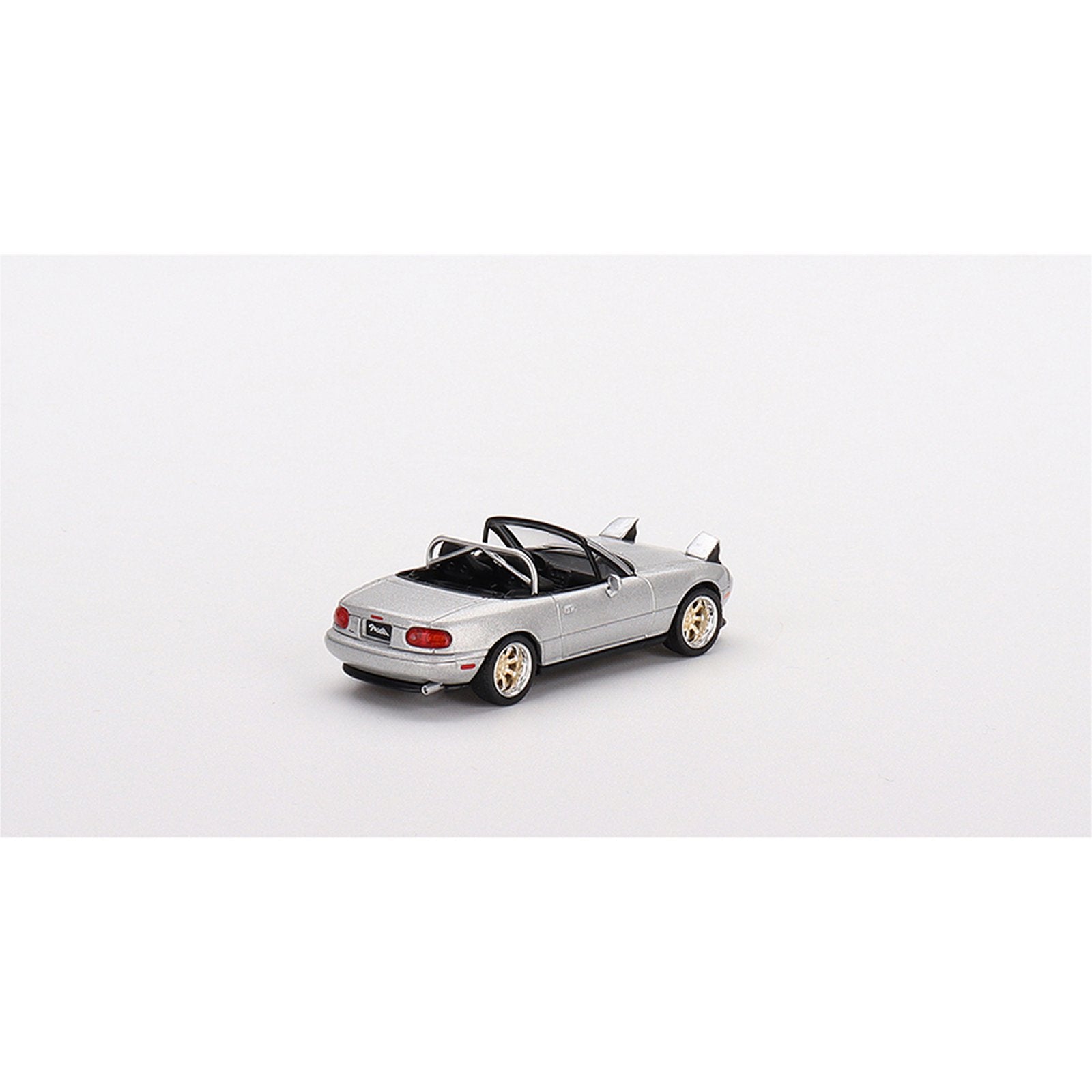 This Mazda Miata MX-5 Tuned Version (NA RHD) diecast model car is silver stone metallic and features working wheels. It is made by Mini GT and is 1:64 scale (approx. 6cm / 2.4in long).