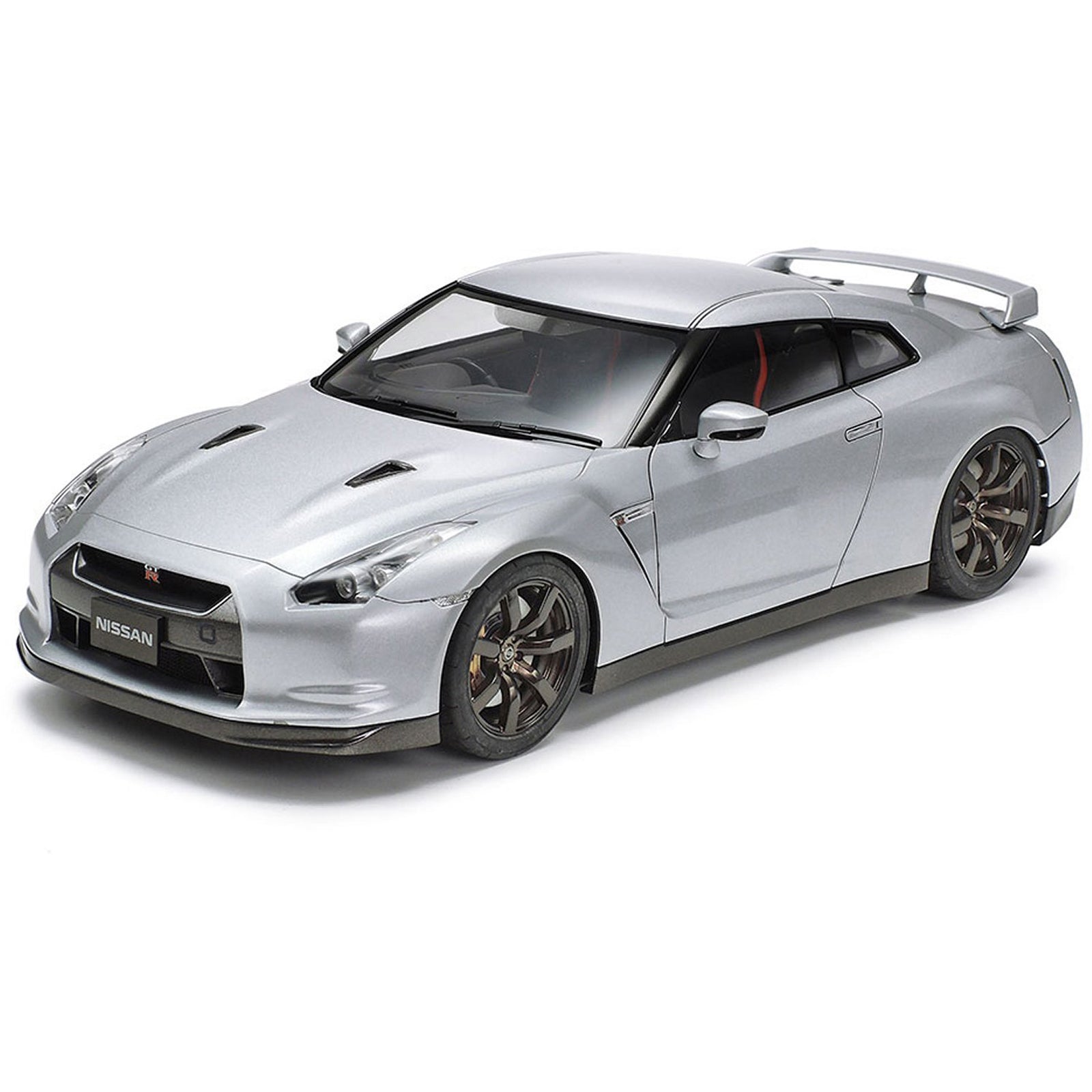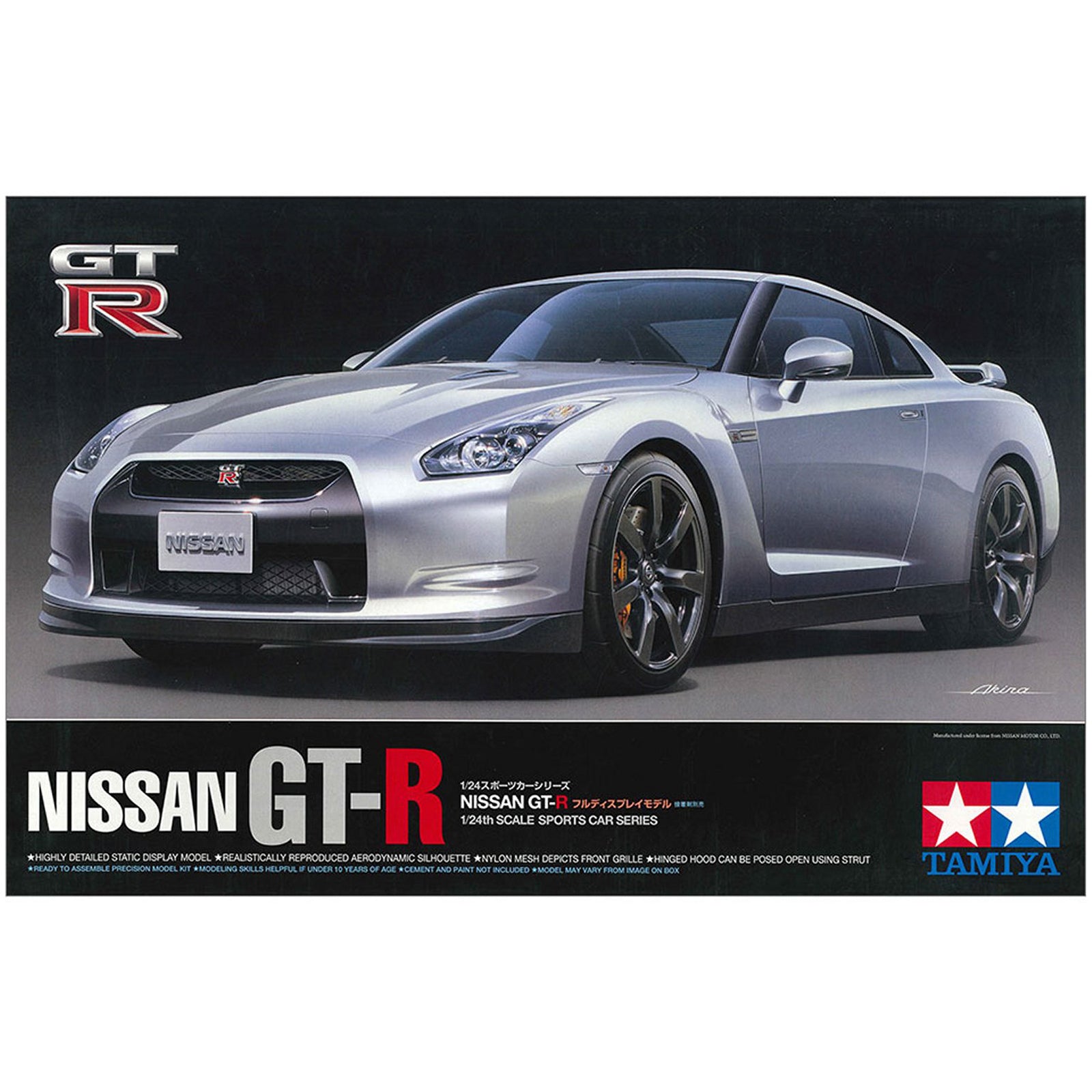 This Nissan GT-R plastic model car kit. It is made by Tamiya and Made from plastic and rubber it is 1:24 scale measuring approx. 19cm / 7.5in long. This is a glue together self assembly model kit with a difficulty rating of 4 (Hard).