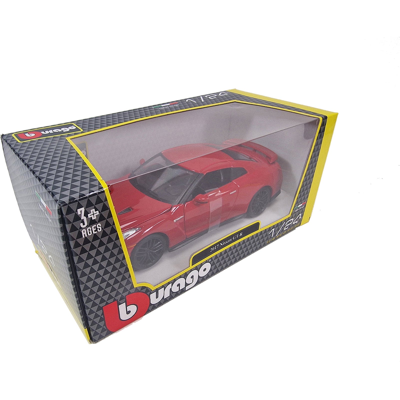 This Nissan GT R R-35 (2017) diecast model car is red and features working wheels and opening bonnet with engine, doors. It is made by Bburago and is 1:24 scale (approx. 18cm / 7.1in long).