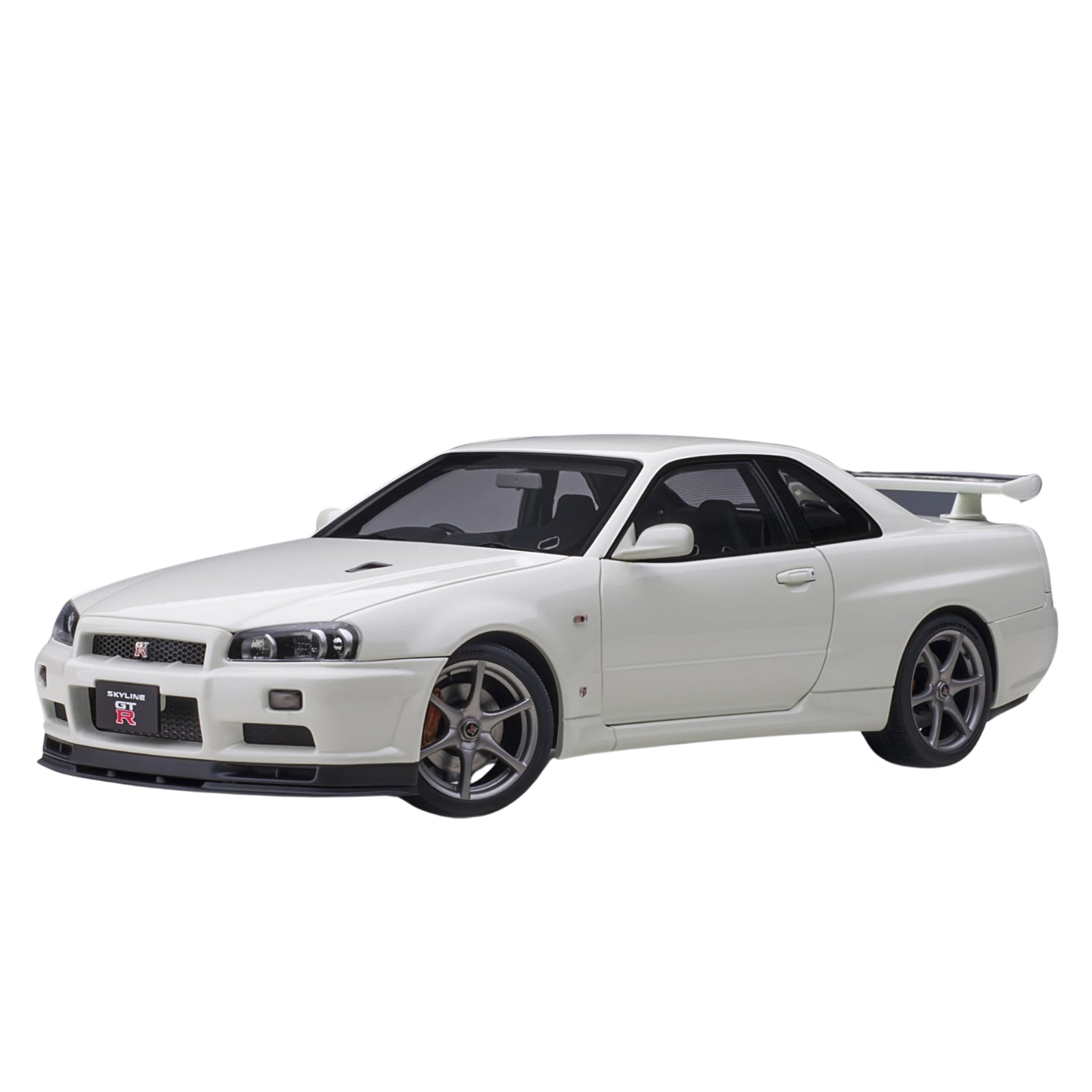 This Nissan GT-R V-spec II (R34) diecast model car is white pearl and features working steering, wheels and opening bonnet with engine, boot, doors. It is made by AUTOart and is 1:18 scale (approx. 25cm / 9.8in long).