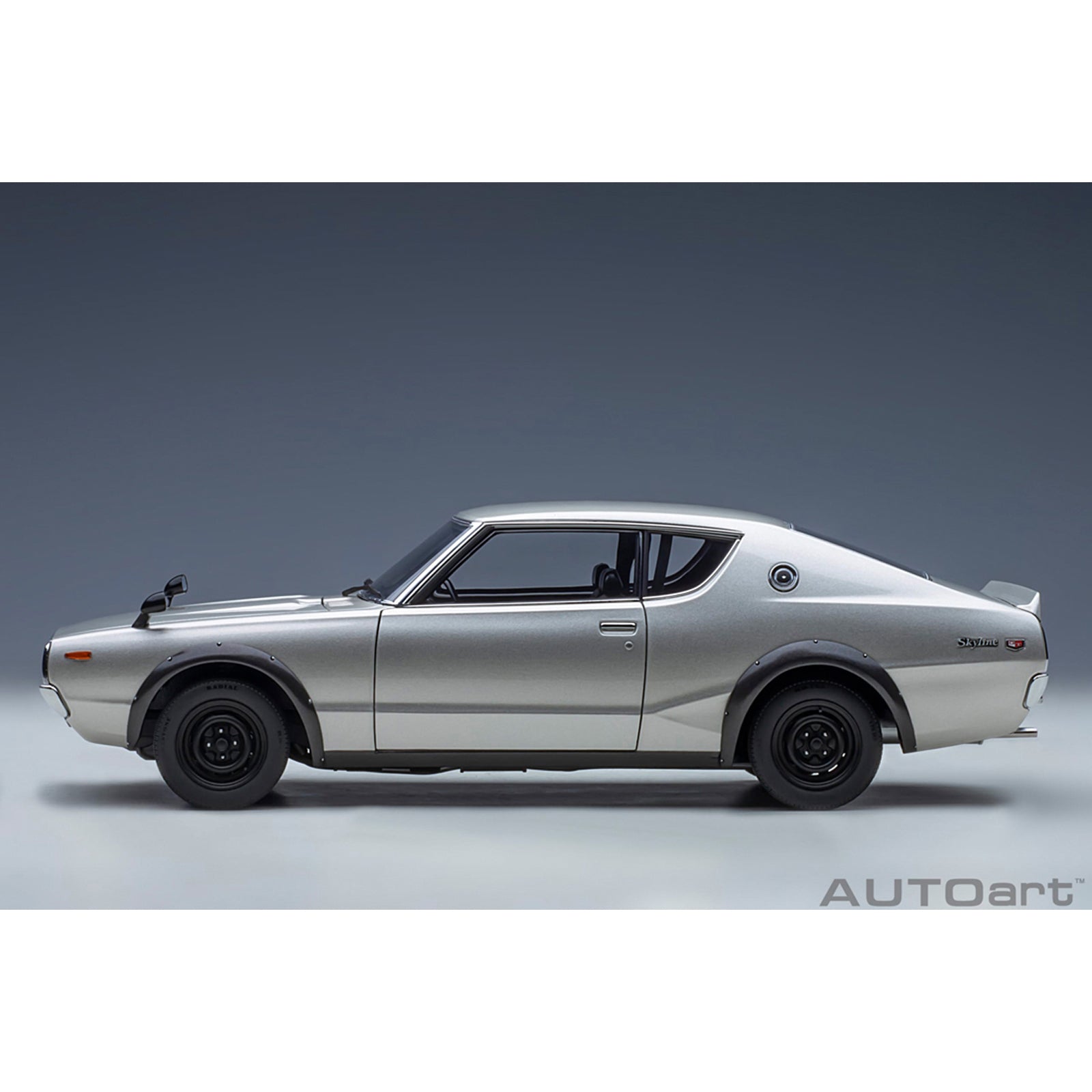 This Nissan Skyline GT-R (KPGC110 1973) diecast model car is silver and features working wheels, steering and opening bonnet with engine, boot with spare wheel, doors. It is made by AUTOart and is 1:18 scale (approx. 25cm / 9.8in long).