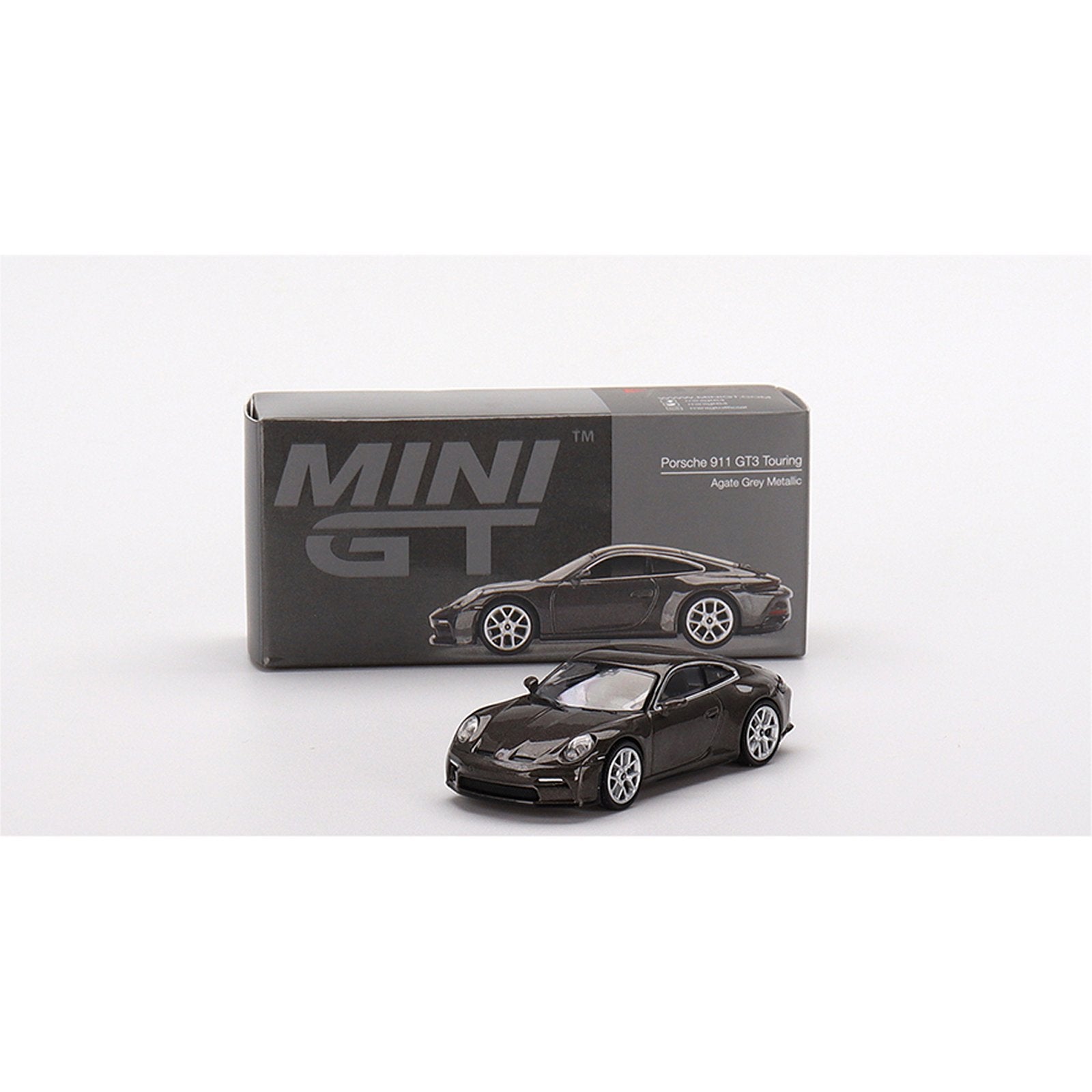 This Porsche 911 GT3 Touring (992 RHD) diecast model car is agate grey metallic and features working wheels. It is made by Mini GT and is 1:64 scale (approx. 7cm / 2.8in long).