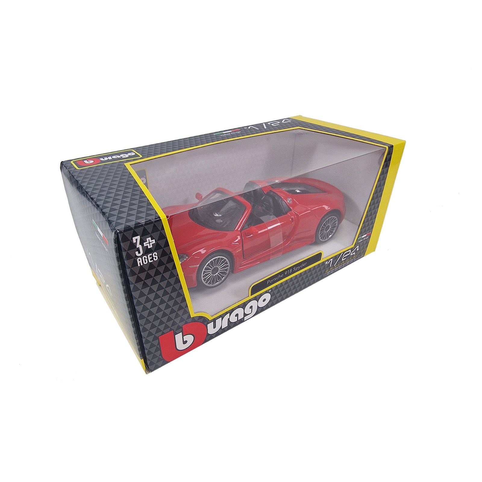 This Porsche 918 Spyder diecast model car is red and features working wheels, steering and opening doors. It is made by Bburago and is 1:24 scale (approx. 18cm / 7.1in long).