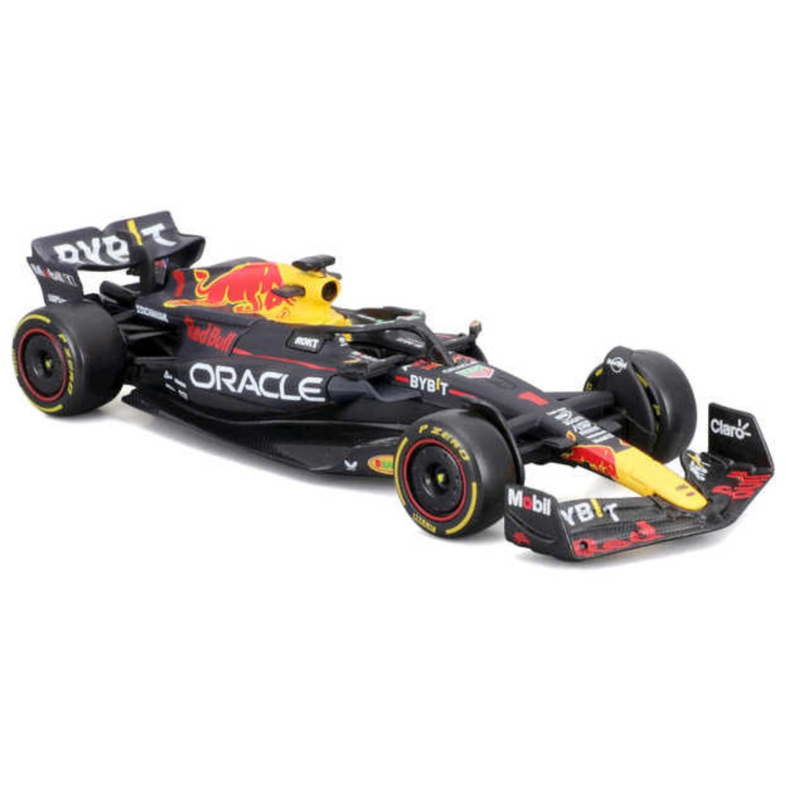 This Red Bull Racing RB19 (No.1 2023 driven by Max Verstappen) diecast model grand prix car is blue. It is made by Bburago and features working wheels. Made from metal and plastic it is 1:43 scale measuring approx. 13cm / 5.1in long.