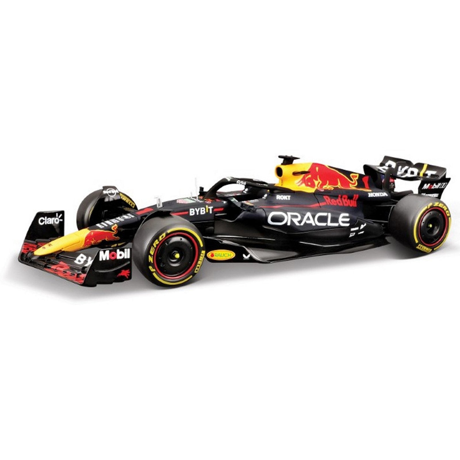 This Red Bull Racing RB19 (Wolrd Champion With Figure 2023 driven by Max Verstappen) diecast model grand prix car is blue. It is made by Bburago and features working wheels. extra display accessories. Made from metal and plastic it is 1:24 scale measuring approx. 23cm / 9.1in long.