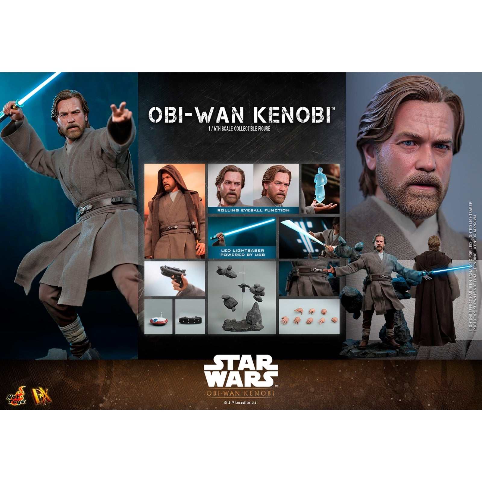 The Star Wars collectible figure is meticulously crafted with a newly developed head sculpt with rolling eyeball function allowing postionable eyelline, finely tailored Jedi outfit, LED light-up lightsaber, an interchangeable lightsaber blade emulating the weapon in motion, a blaster pistol, a LO-LA59 droid, binoculars, holoprojector, a Bail Organa hologram miniature, and a rocky diorama base on which to recreate Obi-Wan’s showdown with Darth Vader!