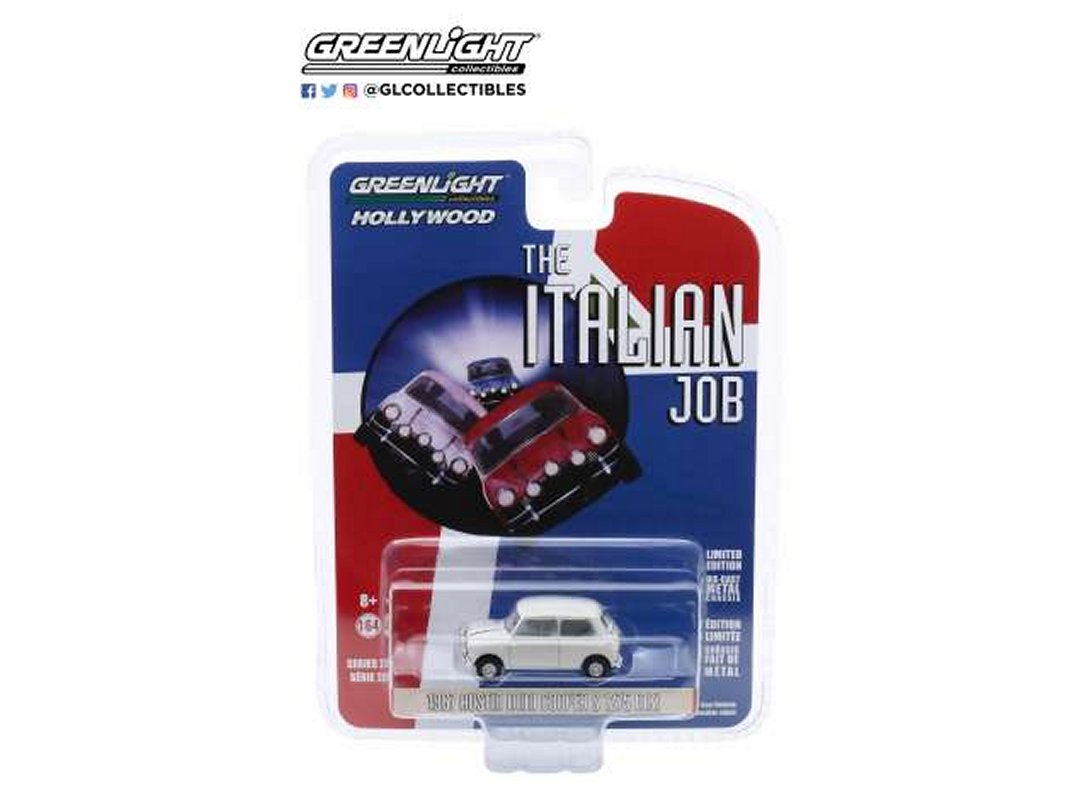 This Austin Mini Cooper S (1275 MK1) diecast model car featured in The Italian Job is white and features working wheels. It is made by Green Light Collectibles and is 1:64 scale (approx. 5cm / 2in long).