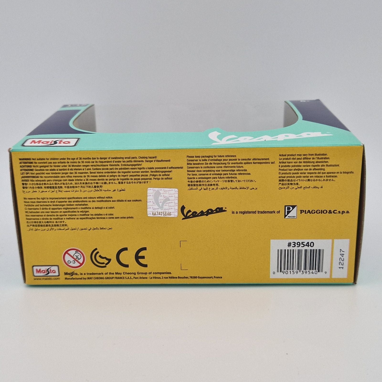 This Vespa 946 Bellissima (2014) diecast model motorcycle is grey. It is made by Maisto and features working side stand and steering as well as working wheels. Made from metal and plastic it is 1:18 scale measuring approx. 11cm / 4.3in long.