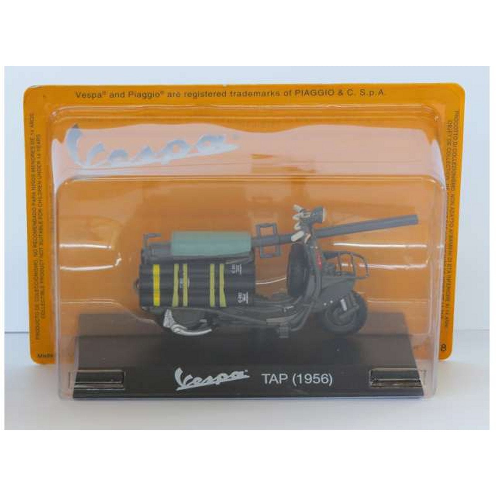 This Vespa TAP (1956) diecast model motorcycle is grey and features working wheels. It is made by Ex Mag and is 1:18 scale (approx. 10cm / 3.9in long).